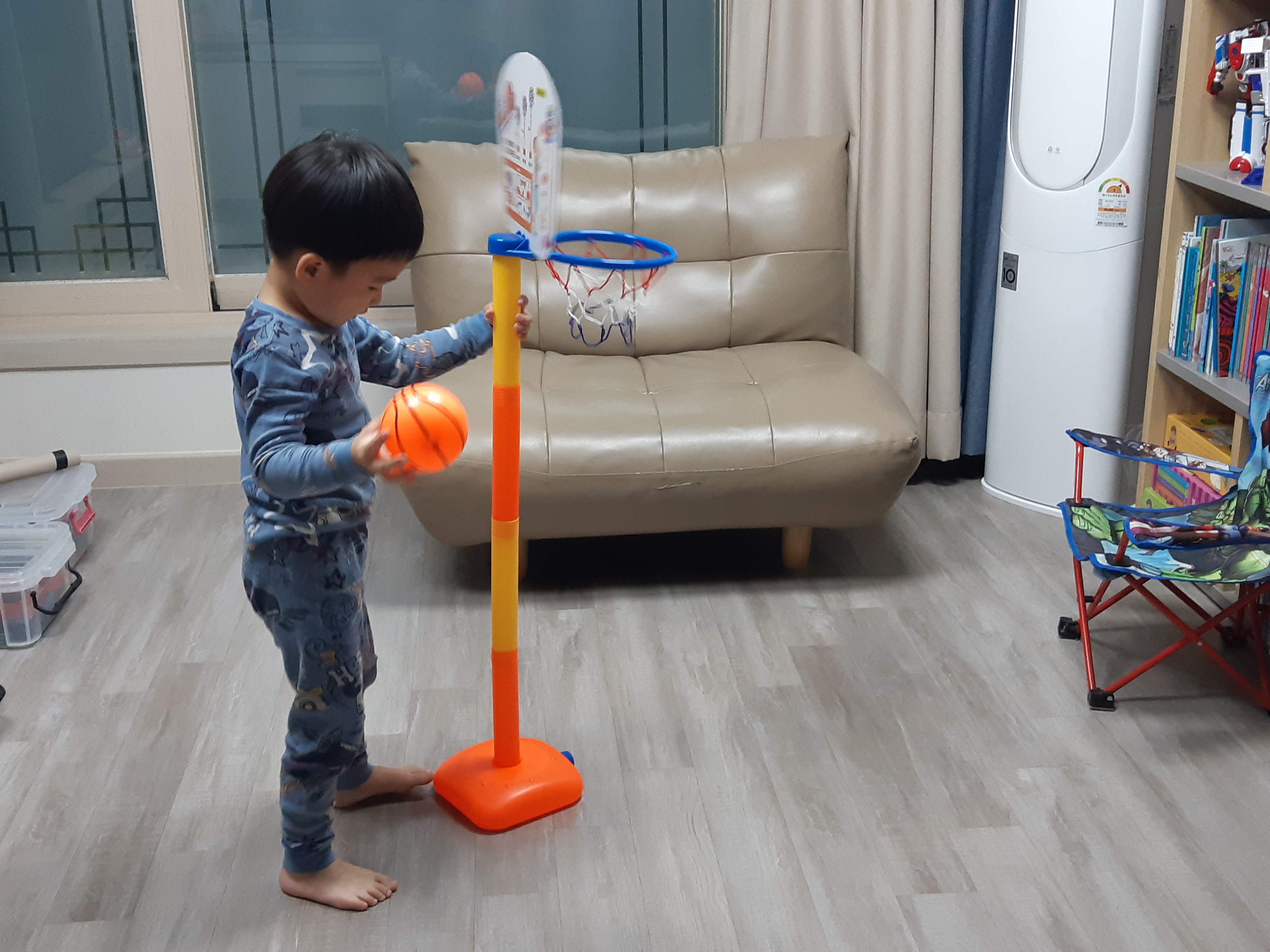 바닥에 물을 넣어 고정할 수도 있고 높이도 있는 것 같아서 사보기로 했다. 에너지가 많아서인지 밤에 잘 안자려고 해서 체력 소모를 위해 오늘 미니농구대를 사용해봐야겠다. 아들~ 오늘밤 운동 열심히 해보자! 덩크 슛.