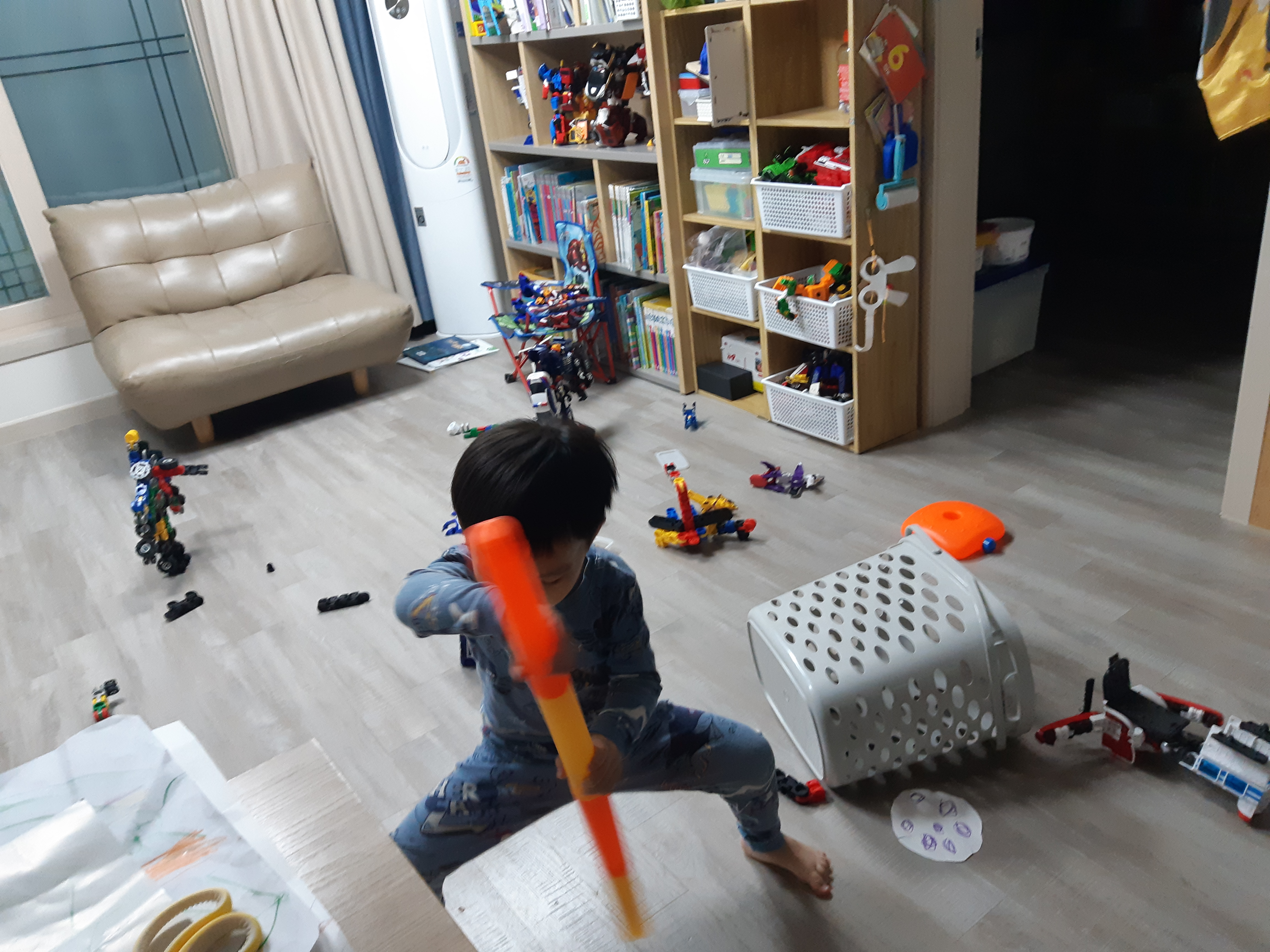 농구를 해야하는데 아들은 농구대에 더 관심이 많은 것 같다. 농구대를 다 분리 시키더니 농구대 봉을 휘두르며 대결 놀이를 하자한다. 역시 우리 아들이다. 봉대가 칼이 되었다. 또 갑자기 헬로카봇 달토끼에 나오는 절구공이 생각났다면서 절구질을 한다. 못말리는 우리 아들. 언제 빨래 바구니는 가져왔는지 거실은 오늘도 난장판이 되었다. 아들아~저녁마다 칼 대결말고 농구하자 !