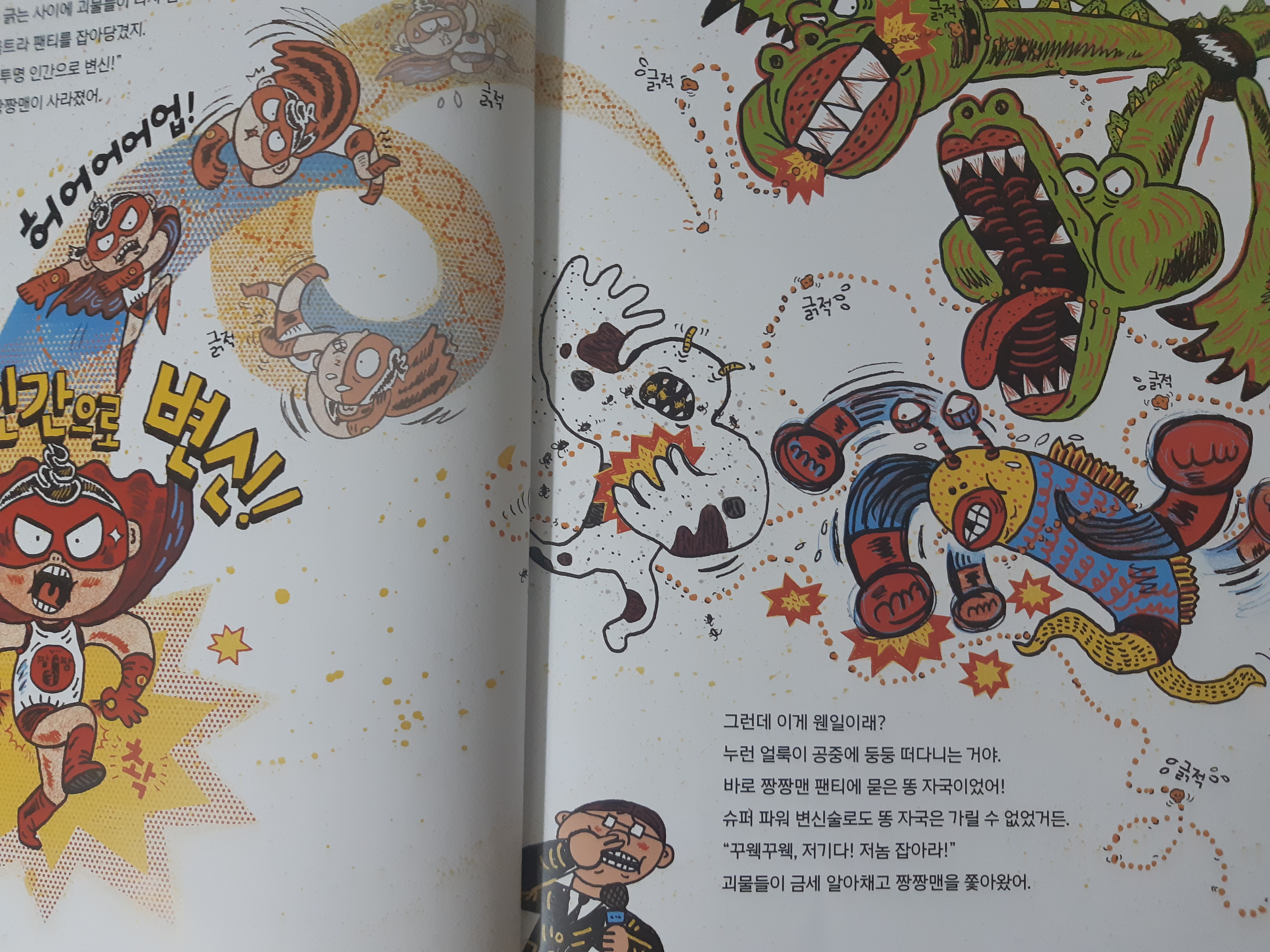 슈퍼히어로 짱짱맨은 숨어 지내다가 똥 도사를 찾아가요. 그리고 똥 닦는 법을 수련하게 되지요.