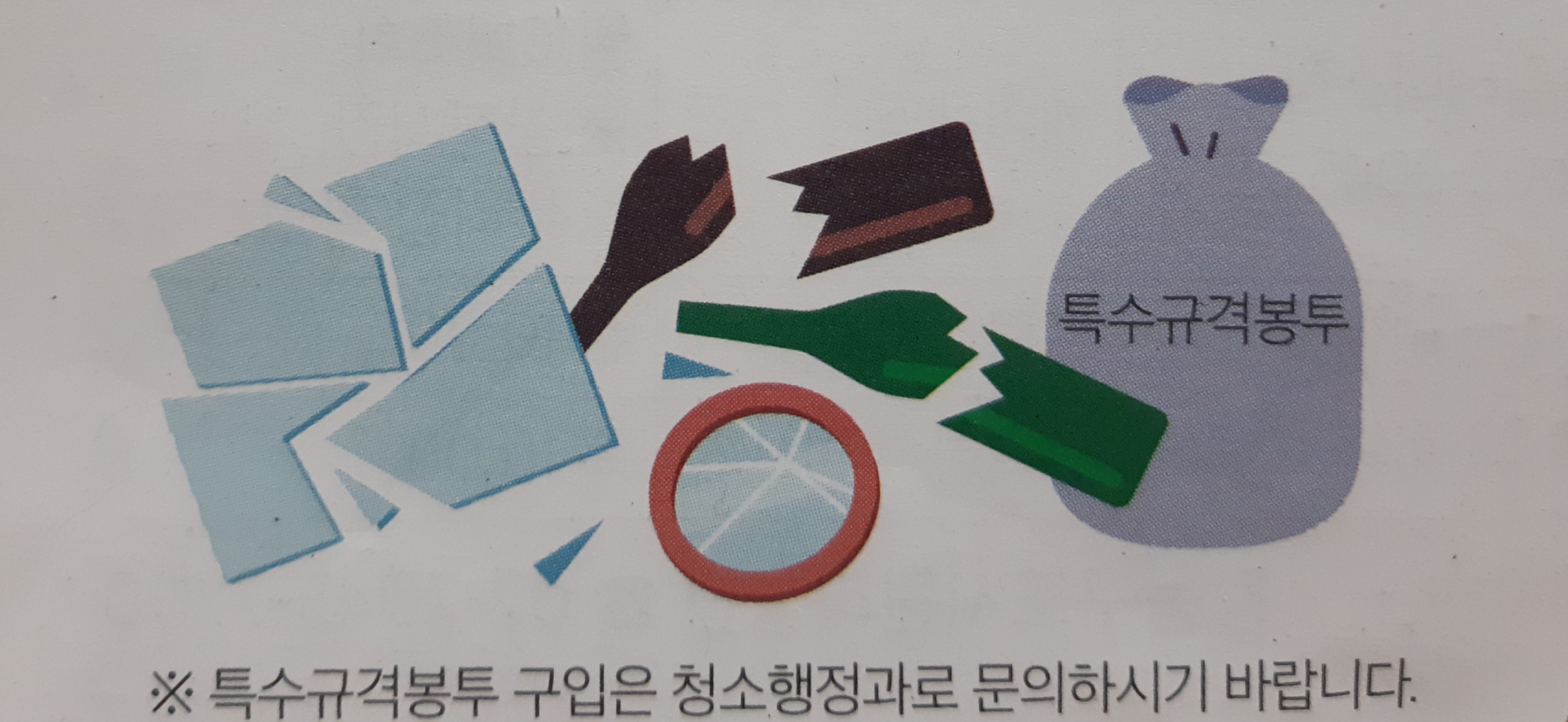 - 깨진 유리, 사기그릇 등 타지 않는 쓰레기는 특수 규격봉투(마대자루)를 구매하여 배출합니다. 깨진 유리가 소량일 경우, 신문지로 잘 깜 싼 후 일반쓰레기로 버립니다. 하지만 유리 양이 많을 경우에는 특수 규격봉투를 구매해서 배출해야 합니다.