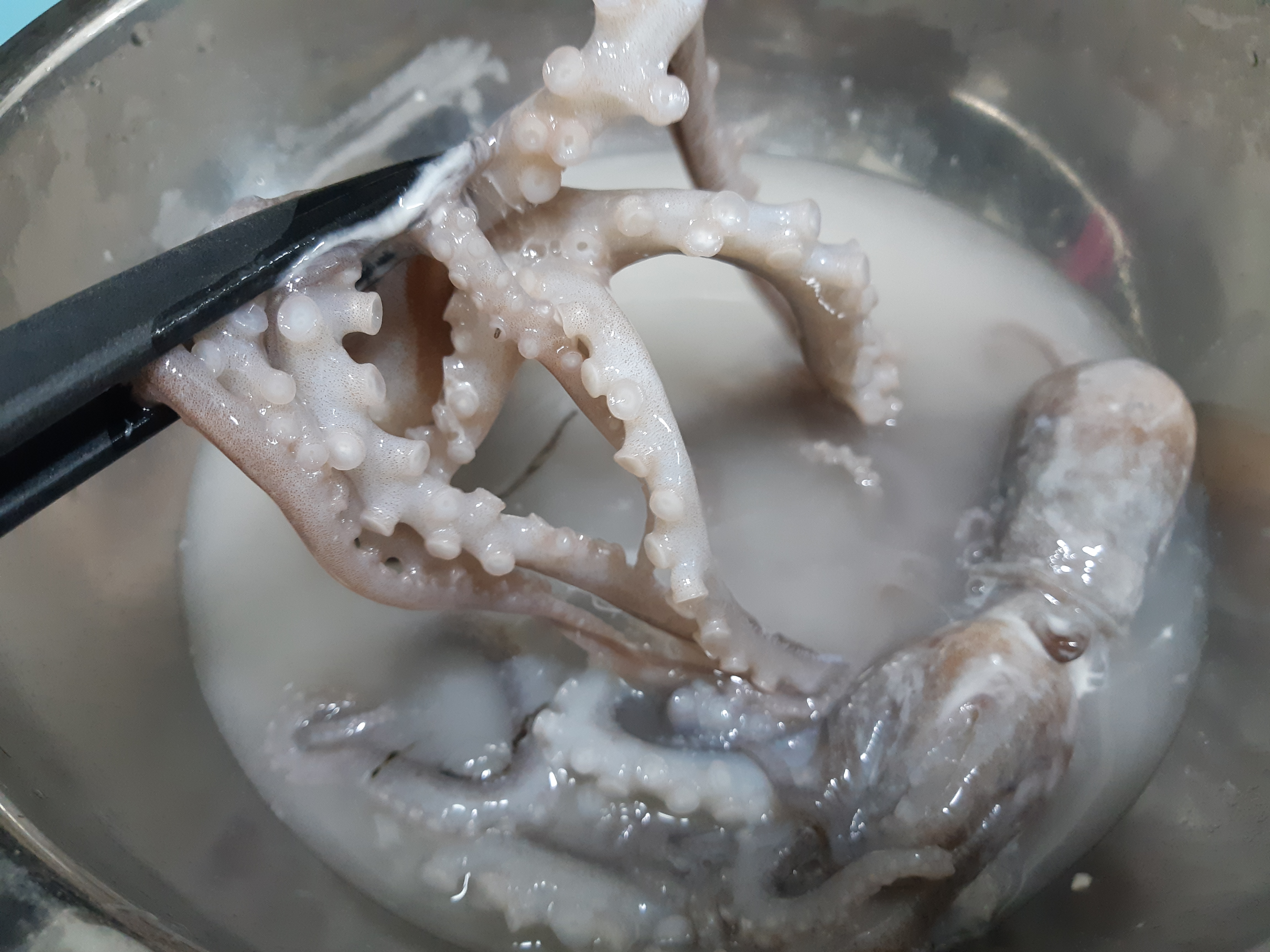 - 1차 밀가루 세척 후 머리 쪽을 잘 뒤집어서 내장과 먹물을 제거한 후 다시 한번 물로 헹궈줍니다. 세척 마무리를 했어요 낙지가 살아있습니다.
