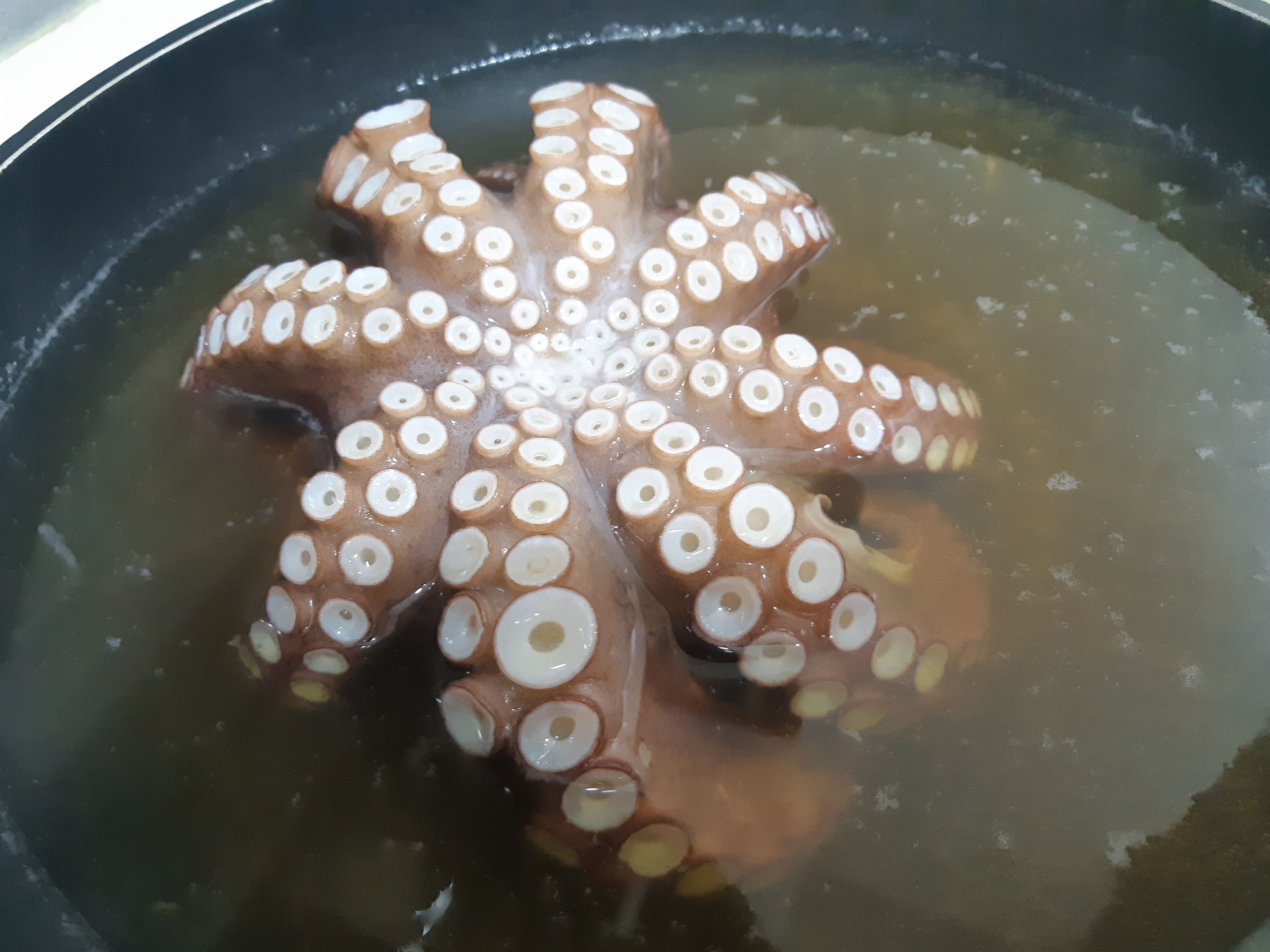 2) 물에 소금(천일염) 1큰술 넣고 끓어오르면 문어 다리(팔)를 넣었다 뺐다는 2~3번 정도 합니다.