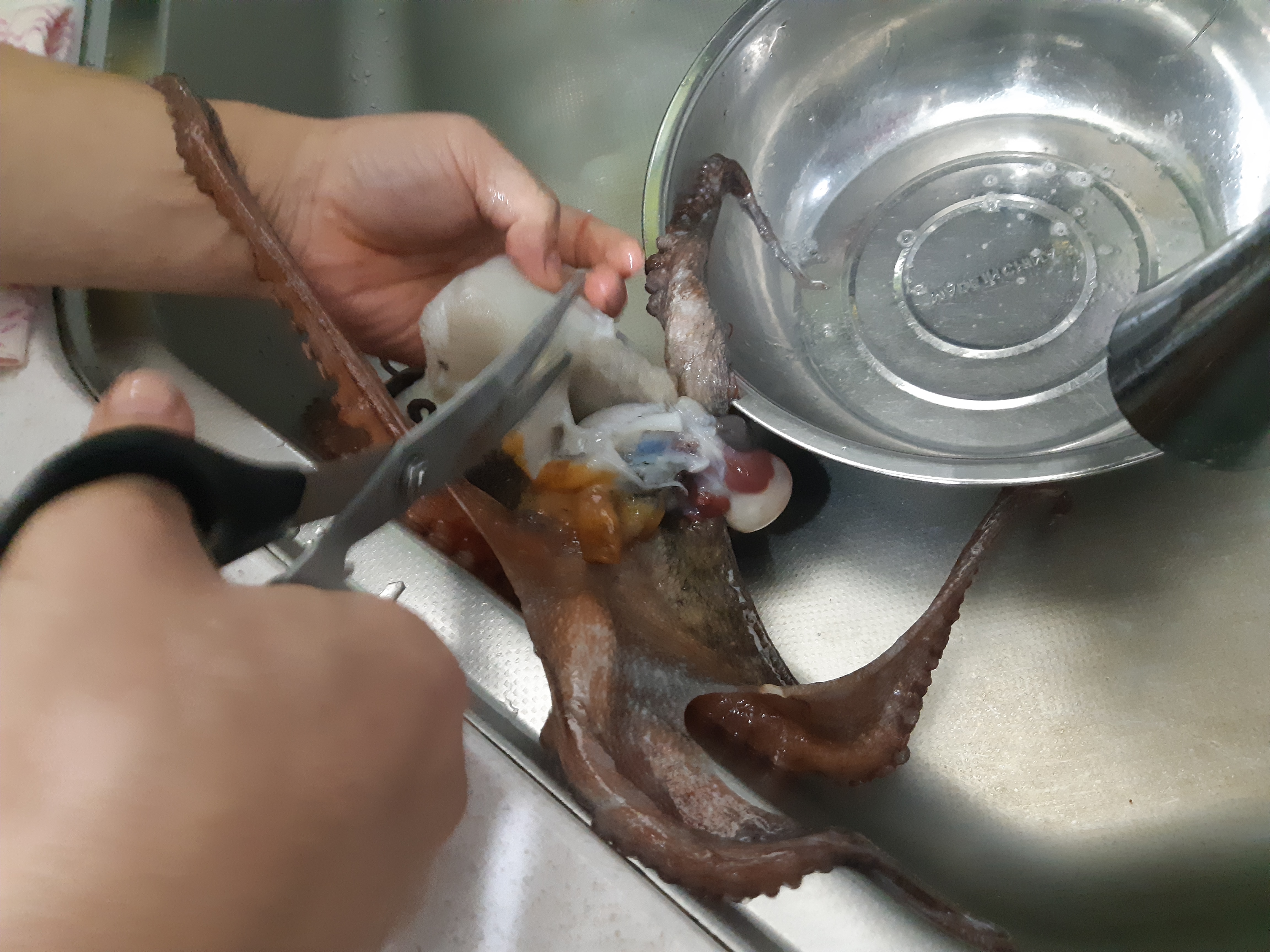 -자른 부분에 손을 넣고 뒤집어 내장 제거합니다. 문어가 힘이 너무 좋습니다. 신랑 힘내요~
