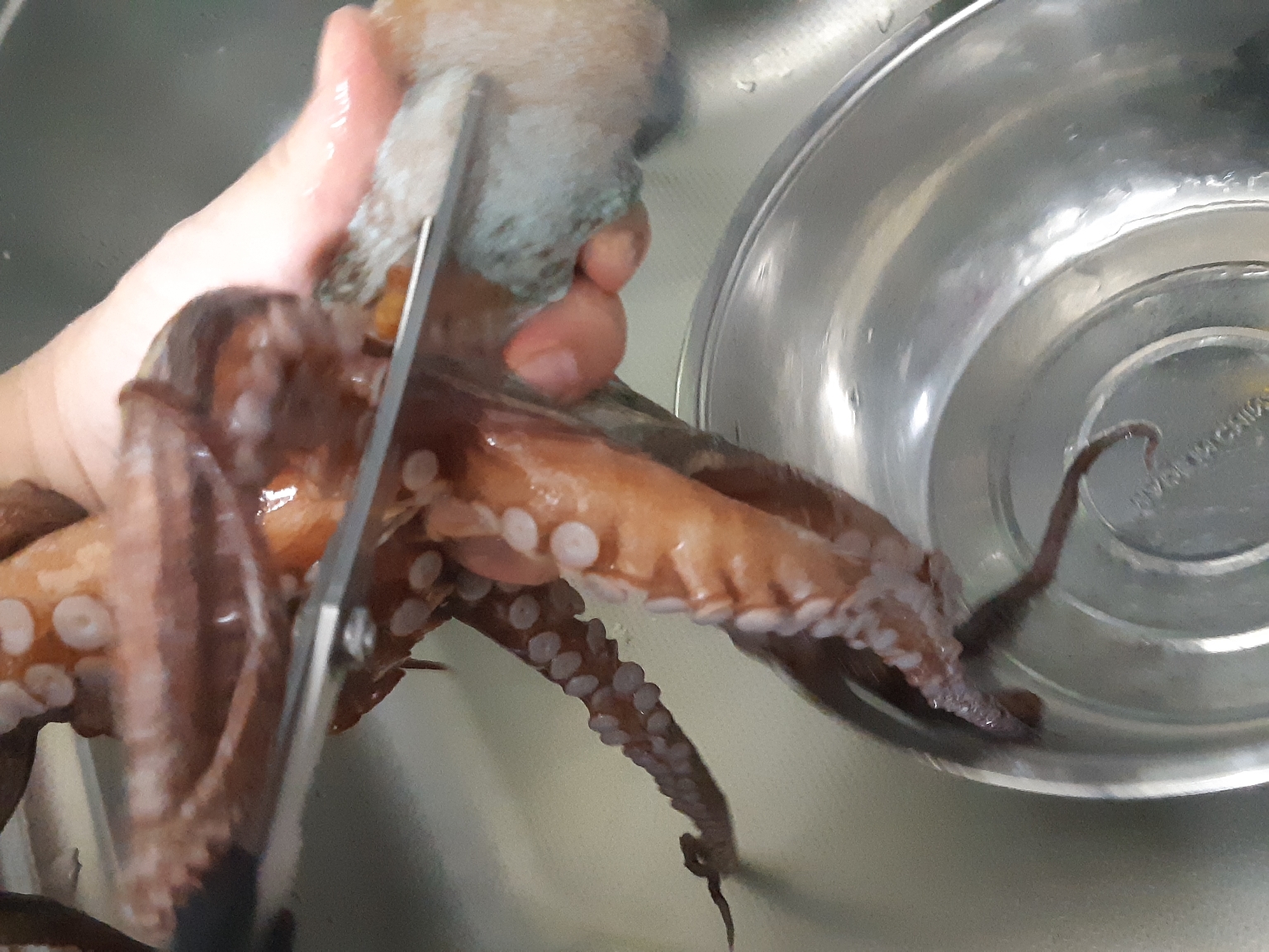 - 문어가 신랑 팔을 감아서 내장 등을 가위로 얼른 잘라내는 중입니다. 눈도 가위로 자르면 됩니다.