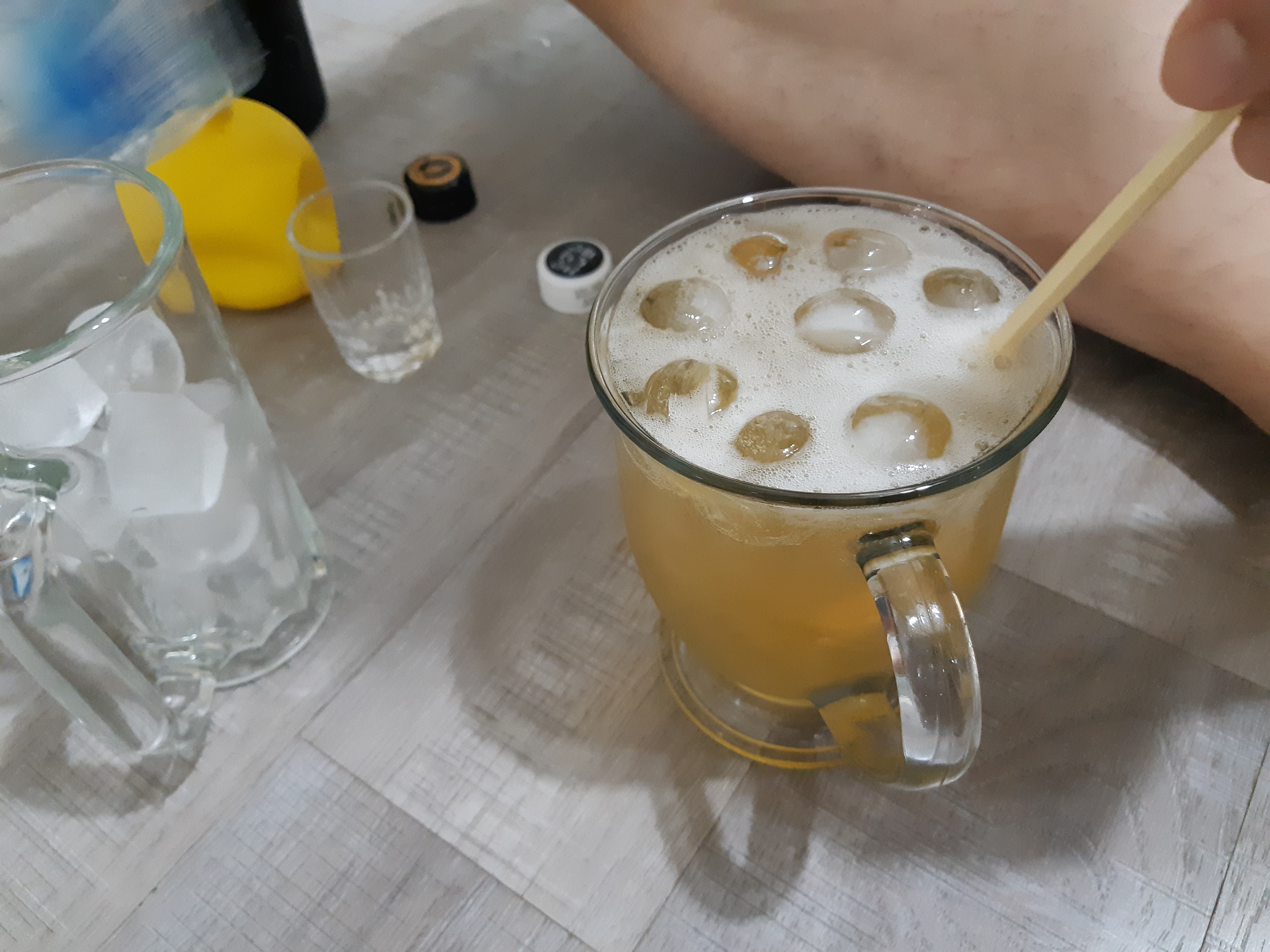 1. 얼음 7~8개나 얼음 가득 넣어 위스키 반잔과 레몬즙 1/4잔을 넣고 저어줍니다. (위스키 많이 넣으면 쉽게 취할 수 있어요. )