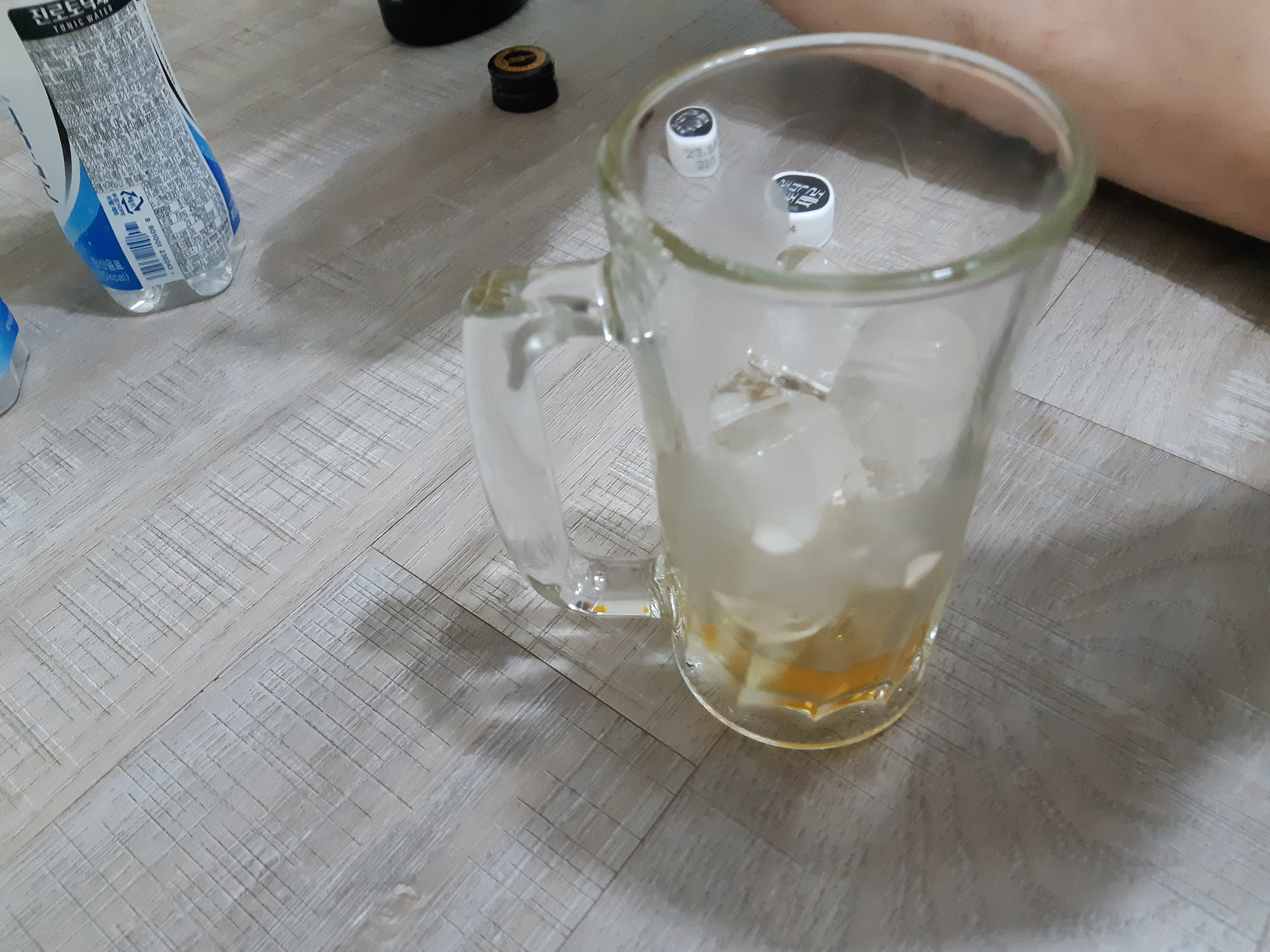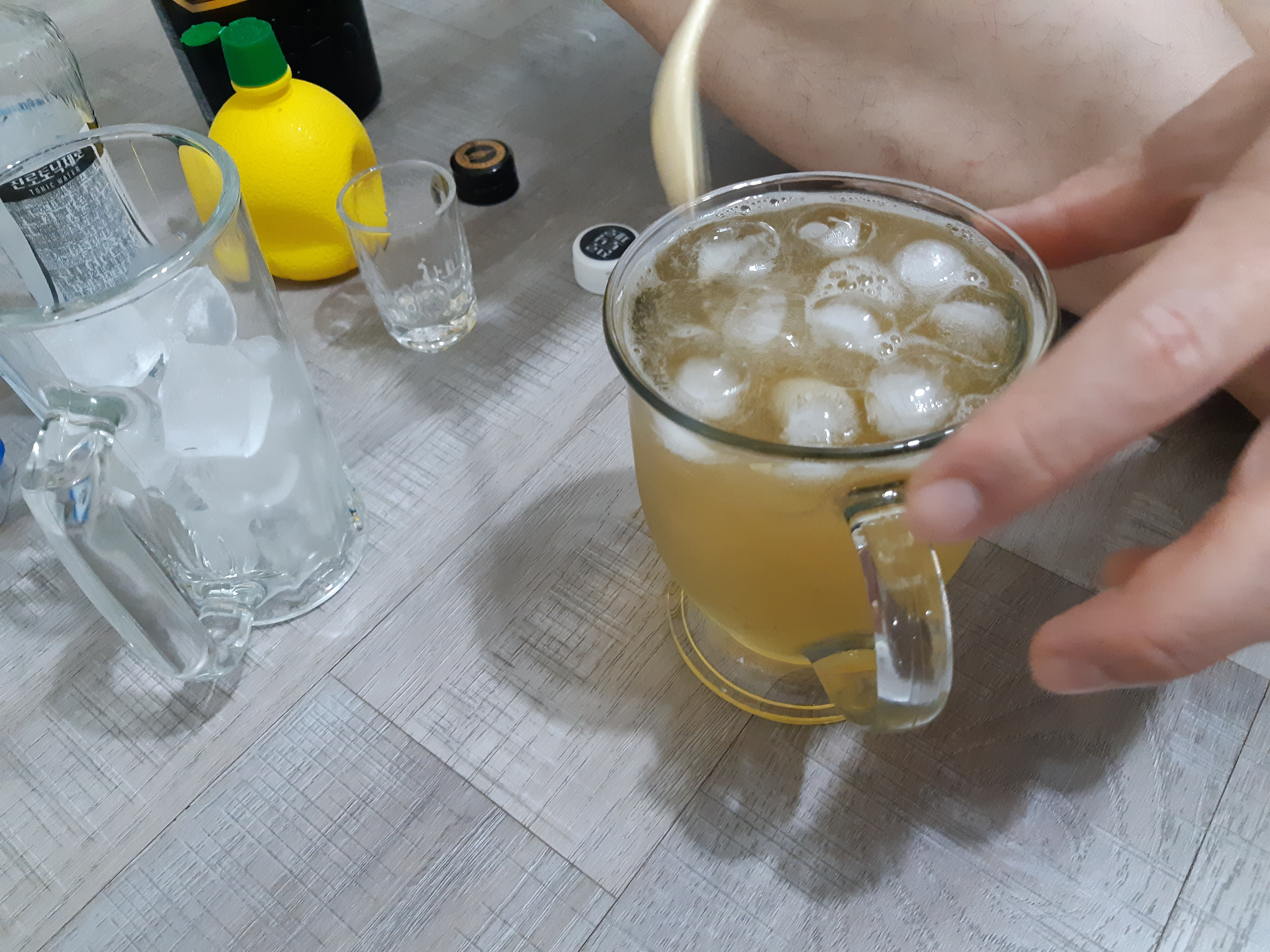 준비물 : 토닉워터 (탄산수), 레몬즙, 위스키, 소주잔, 얼음 적당히, 하이볼 유리잔