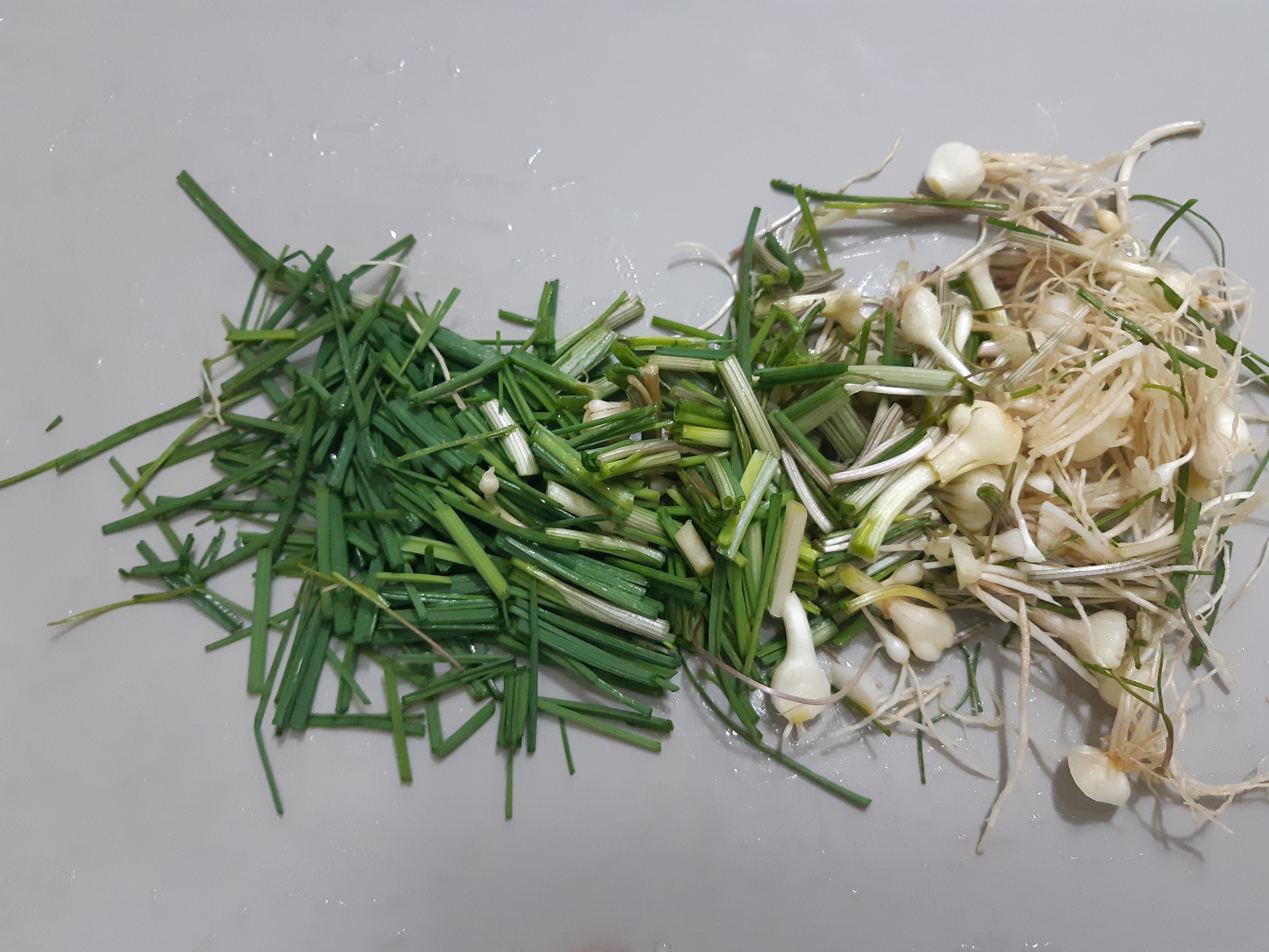 1. 먹기 좋은 사이즈로 달래를 잘라줍니다. 달래 머리 부분이 커서 식감이 걱정된다면 2~3조각으로 잘라주셔도 됩니다.