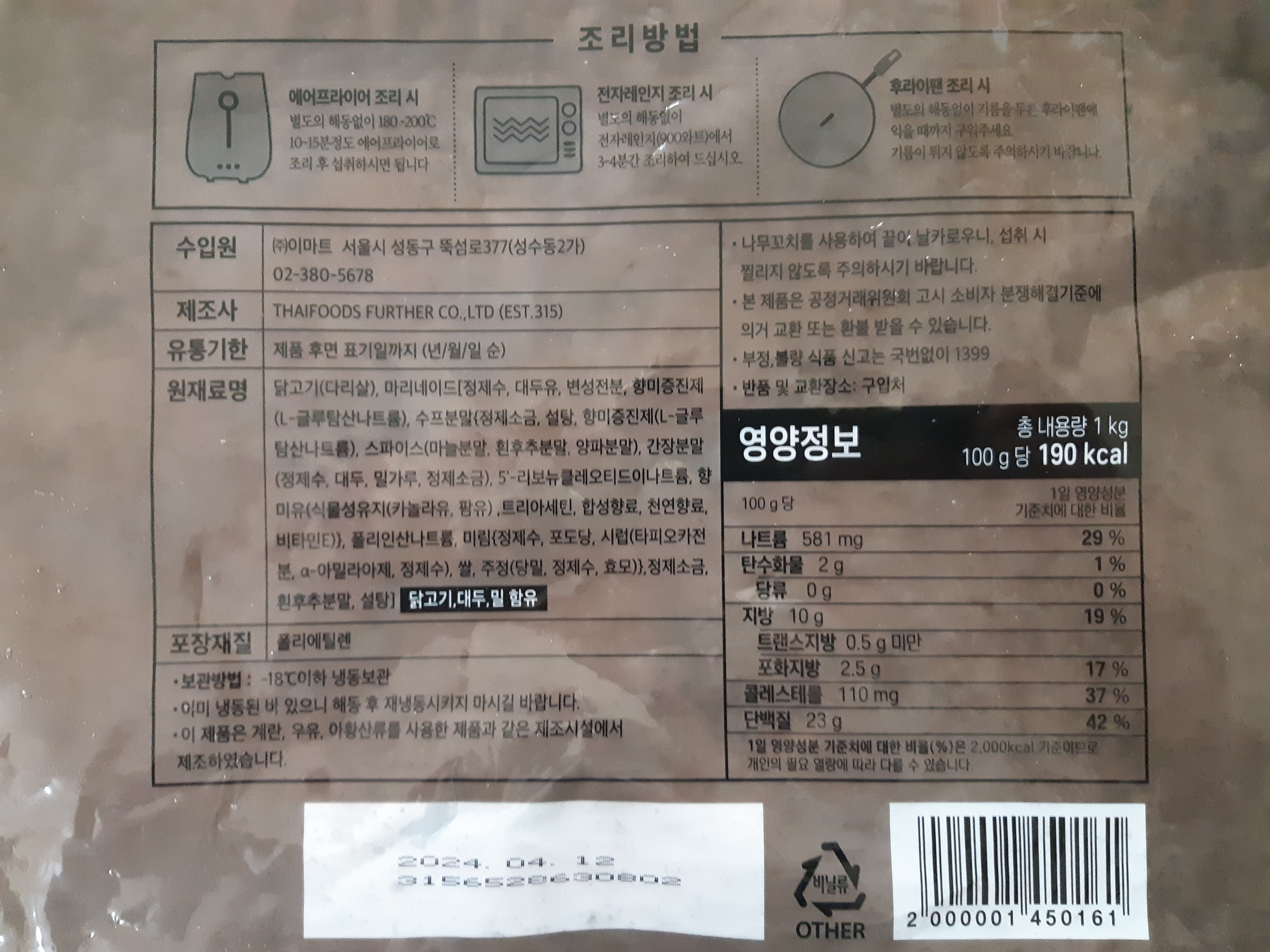 해동 없이 180~200C 10~15분 정도 조리 후 섭취하시면 됩니다.