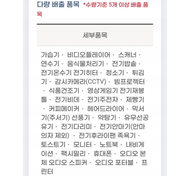 폐가전제품 무상방문 수거서비스를 해주는 곳으로 전화신청(1599-0903)을 하거나 모바일배출예약을 할 수 있습니다. 소형가전제품의 경우에는 다량배출품목으로 5개 이상일 경우에 무상방문수거가 가능하다고 하니 참고하시길 바랍니다. 소형가전제품뿐만 아니라 대형가전제품도 무상방문수거가 가능하다고 합니다.