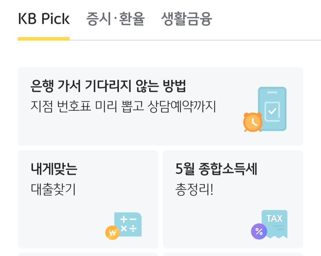 국민은행 앱 첫 화면 하단 부분에 '은행 가서 기다리지 않는 방법'을 눌러주세요.