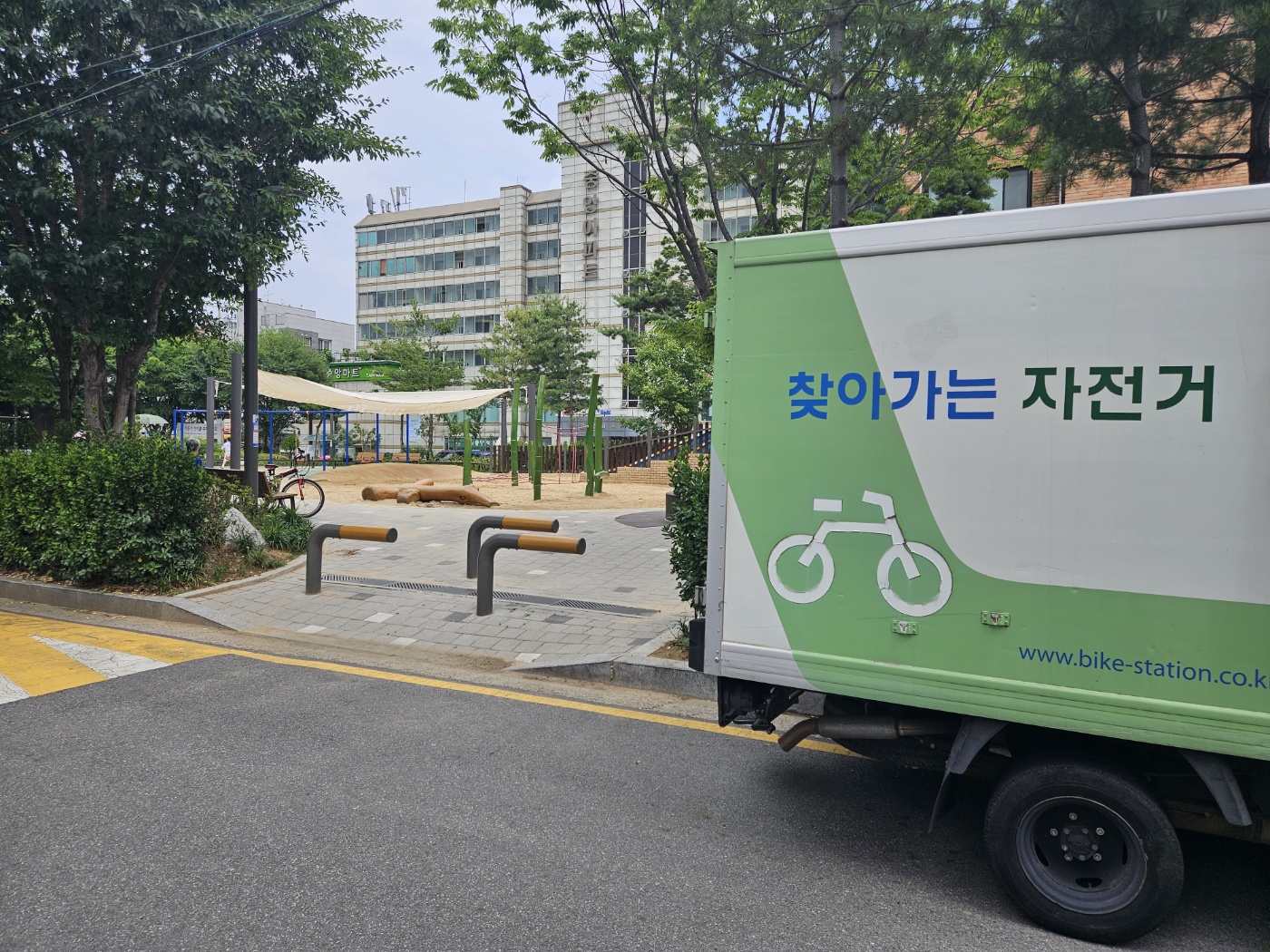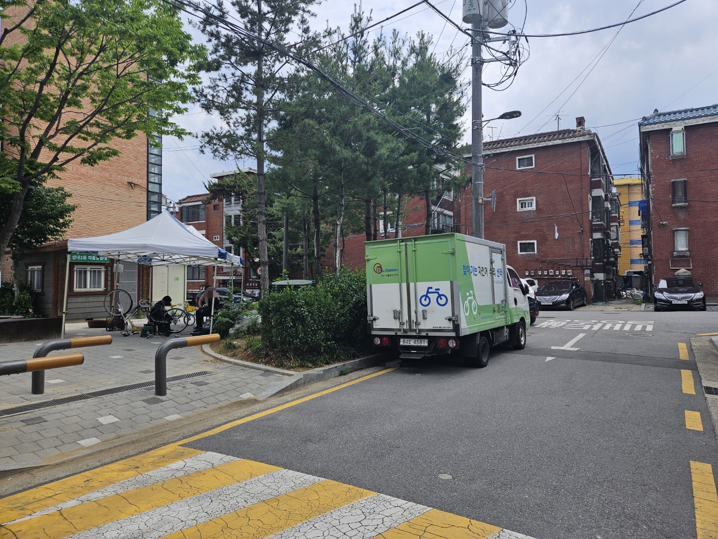 성내동 암말공원 인근에 찾아가는 자전거 수리 센터라는 차량이 주차되어 있습니다. 그 주변 천막이 설치되어 있는 곳에서 순서대로 자전거 수리 서비스를 받으시면 됩니다.