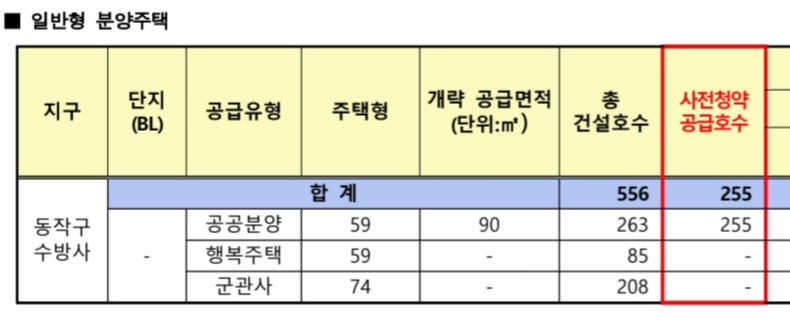 - 서울특별시 동작구 노량진동 154-7번지 일원 총 556호 중 사전청약 공급호수는 255호입니다.
