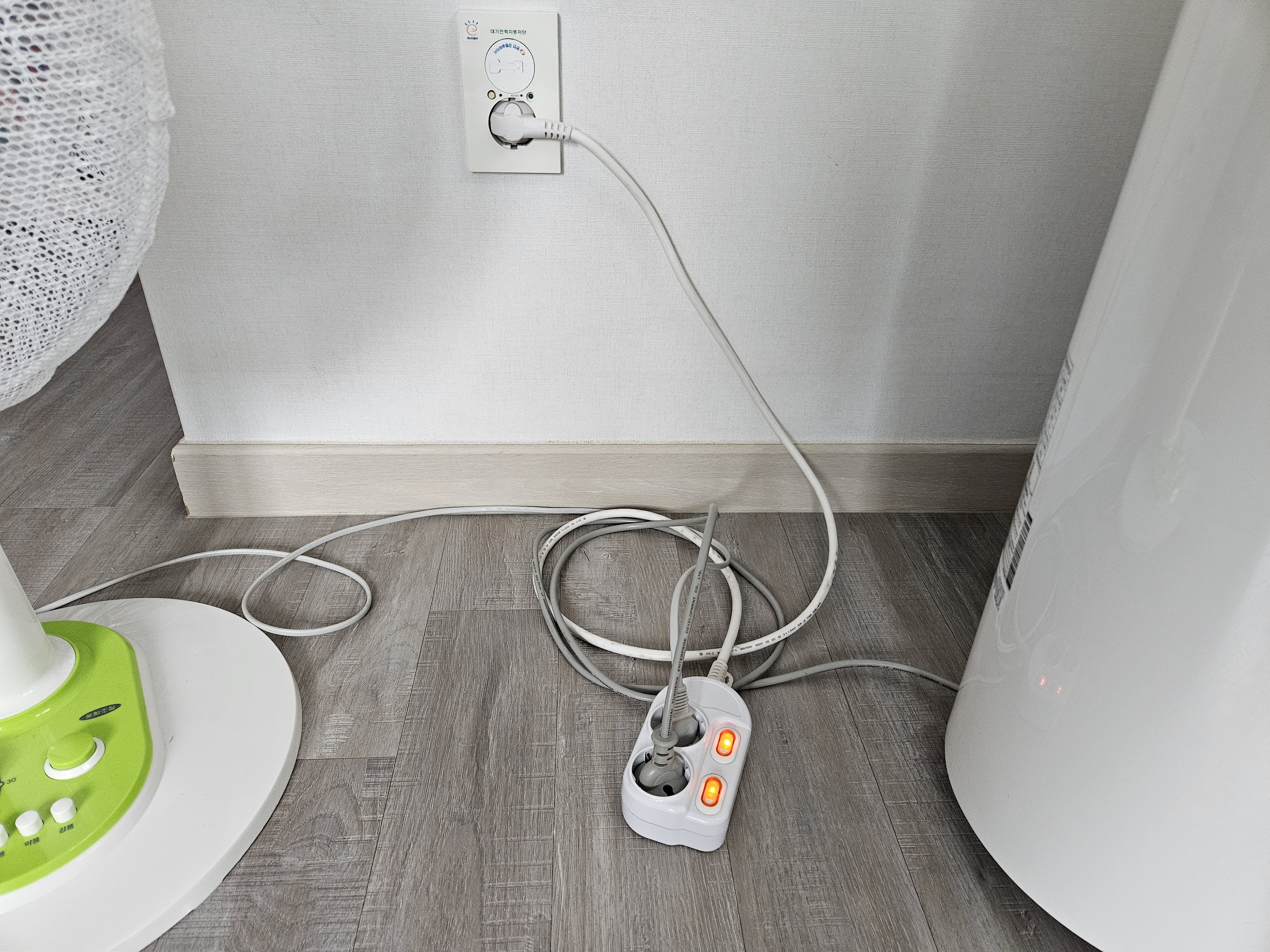 선이 없으니 벽에 붙어 있는 콘센트에 꽂기만 하면 됩니다. 또한 2구 개별 스위치 타입이라서 각각 끄고 켜는 게 가능하고 절전도 되니 좋습니다. 선 있는 타입 2구 개별 스위치를 사용했을 때는 선들이 바닥에 길게 늘어져 있어서 지저분했는데 개별 스위치형 I형으로 사용하니 확실히 깔끔해졌습니다.