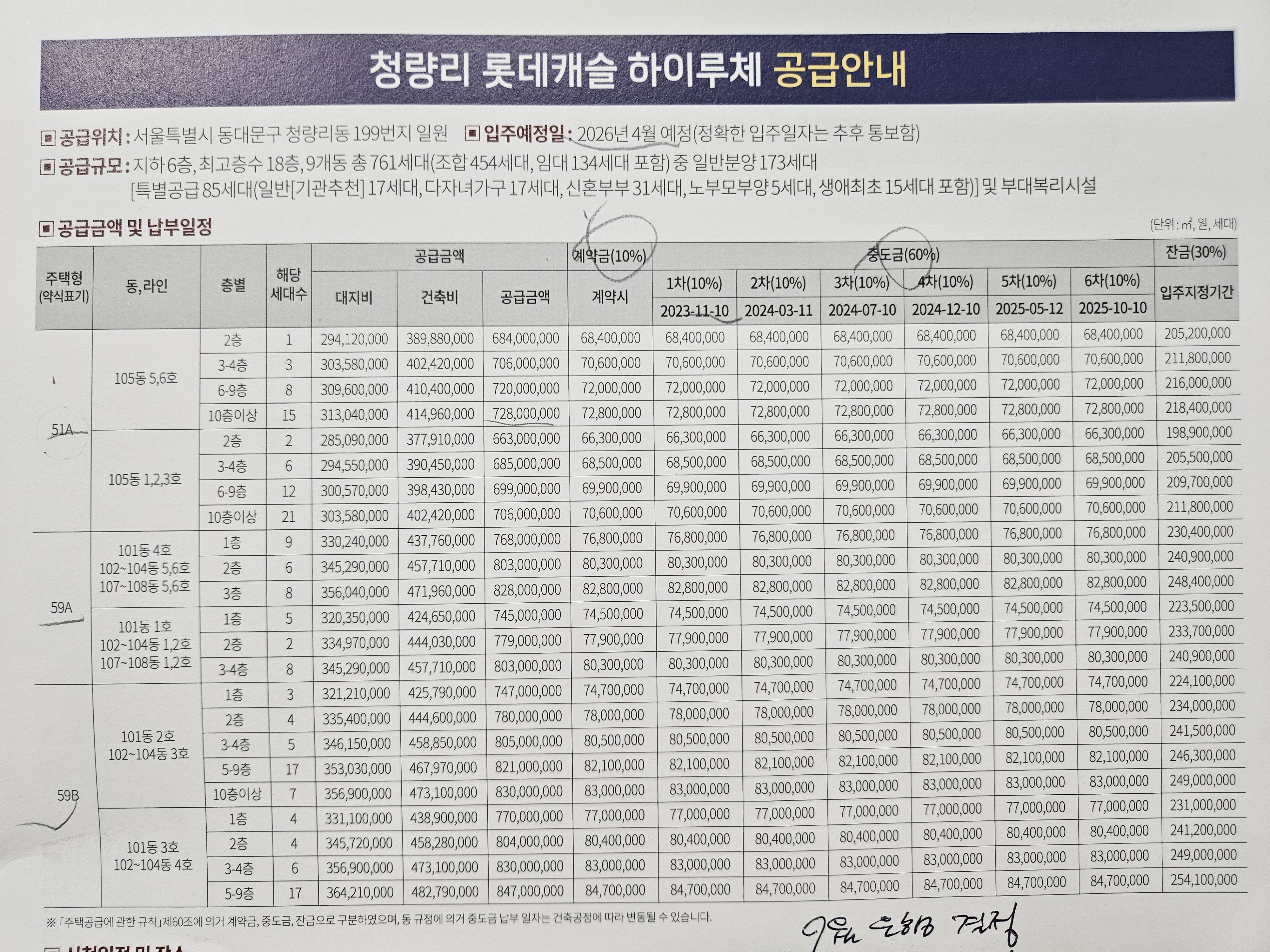 4. 청량리 롯데캐슬 하이루체 층별 공급금액 및 납부 일정(중도금과 잔금일정)