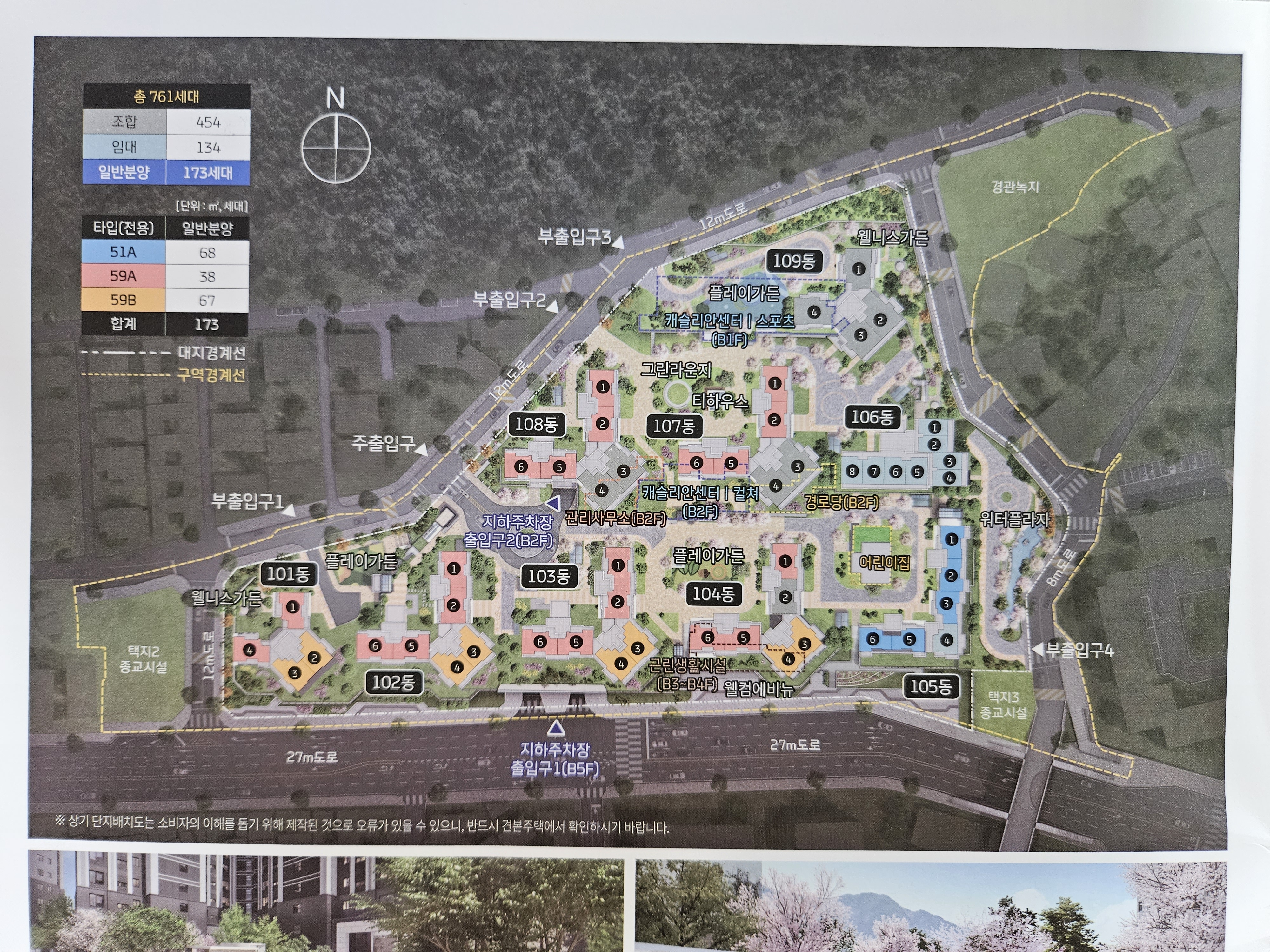 - 이번에 분양하는 동 호수 표이며 105동에는 51 타입인데 타워형 구조는 임대동이라고 합니다. 커뮤니티 스포츠 시설은 109동 근처, 도서관 등 문화 시설은 107동 지하에 있다고 합니다.