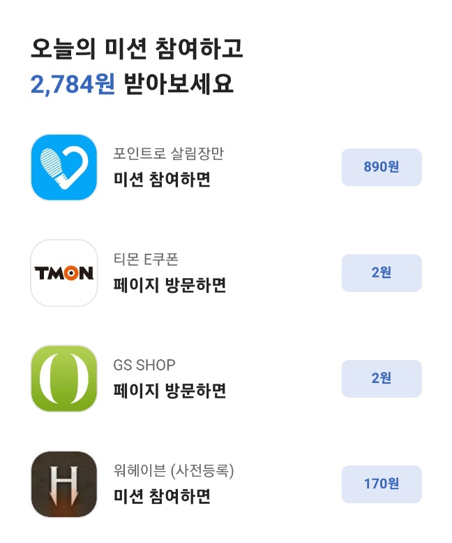 데일리 용돈 이외에 하단에 오늘의 미션 참여로 미션금을 받을 수 있는데요. 페이지 방문, 가입하기, 물건 구매하기 등에 참여할 경우 설정된 금액의 용돈을 받을 수 있습니다. 페이지 방문이 가장 쉬운 방법인데 페이지 방문 후 일정 시간이 지나면 다시 참여하여 미션금을 받을 수 있습니다.