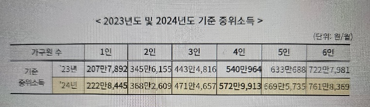 2024년 기준 중위소득의 인상액을 아래 표로 확인할 수 있는데 23년도 금액과 비교하실 수 있습니다. 1인 222만 8,445원, 2인은 368만 2,609원, 3인 471만 4,657원, 4인은 572만 9,913원, 5인은 669만 5,735원, 6인은 761만 8,369원으로 많이 인상되었습니다.
