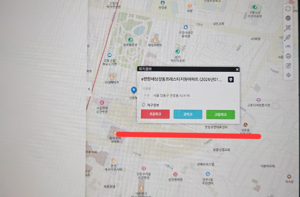 - 예시) 9월 분양 예정인 'e 편한 세상 강동 프레스티지원 아파트'의 배정 초등학교를 알아보도록 하겠습니다.