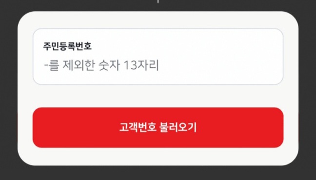 회원가입 후 로그인 하면 '고객번호 불러오기'가 바로 뜹니다. 한전과 계약한 본인의 경우 주민등록번호 입력 후 '고객번호 불러오기'를 하여 등록합니다. 혹시라도 로그인했는데 고객번호 불러오기 화면이 나오지 않을 수도 있습니다. 이 경우에는 첫 화면 하단 '마이' 선택 후 고객번호 등록 항목에 들어가셔서 불러오기를 하시면 됩니다.