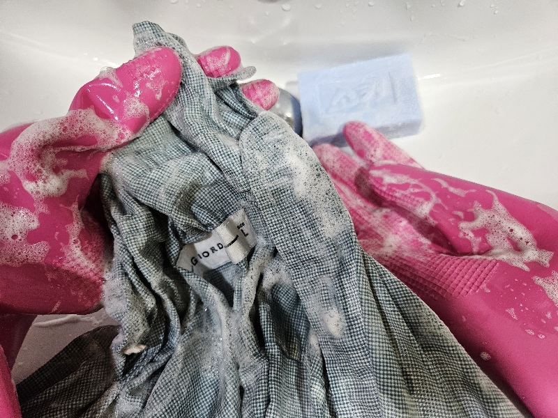2) 찌든 때 있는 부분에 소키 찌든 때 전용비누로 비누칠한 후 2~3번 비벼준다.