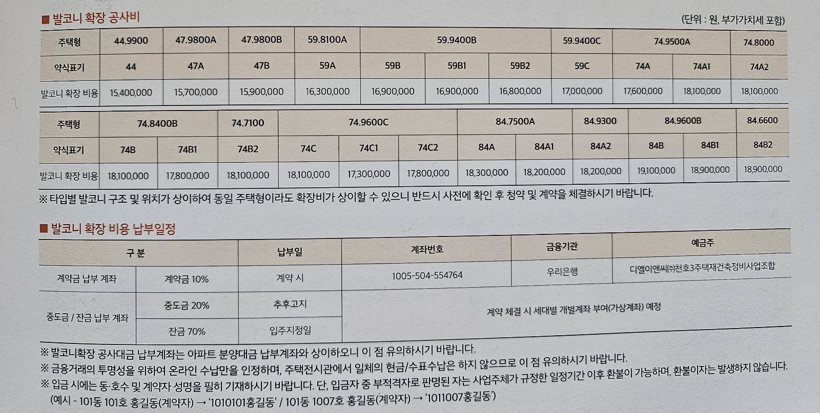 주택타입별 발코니 확장비가 다르며 다음과 같이 확인할 수 있습니다. 타입별 금액이 다르며 15,400,000~18,900,000원입니다. 계약 시 10% 입금을 하셔야 합니다.