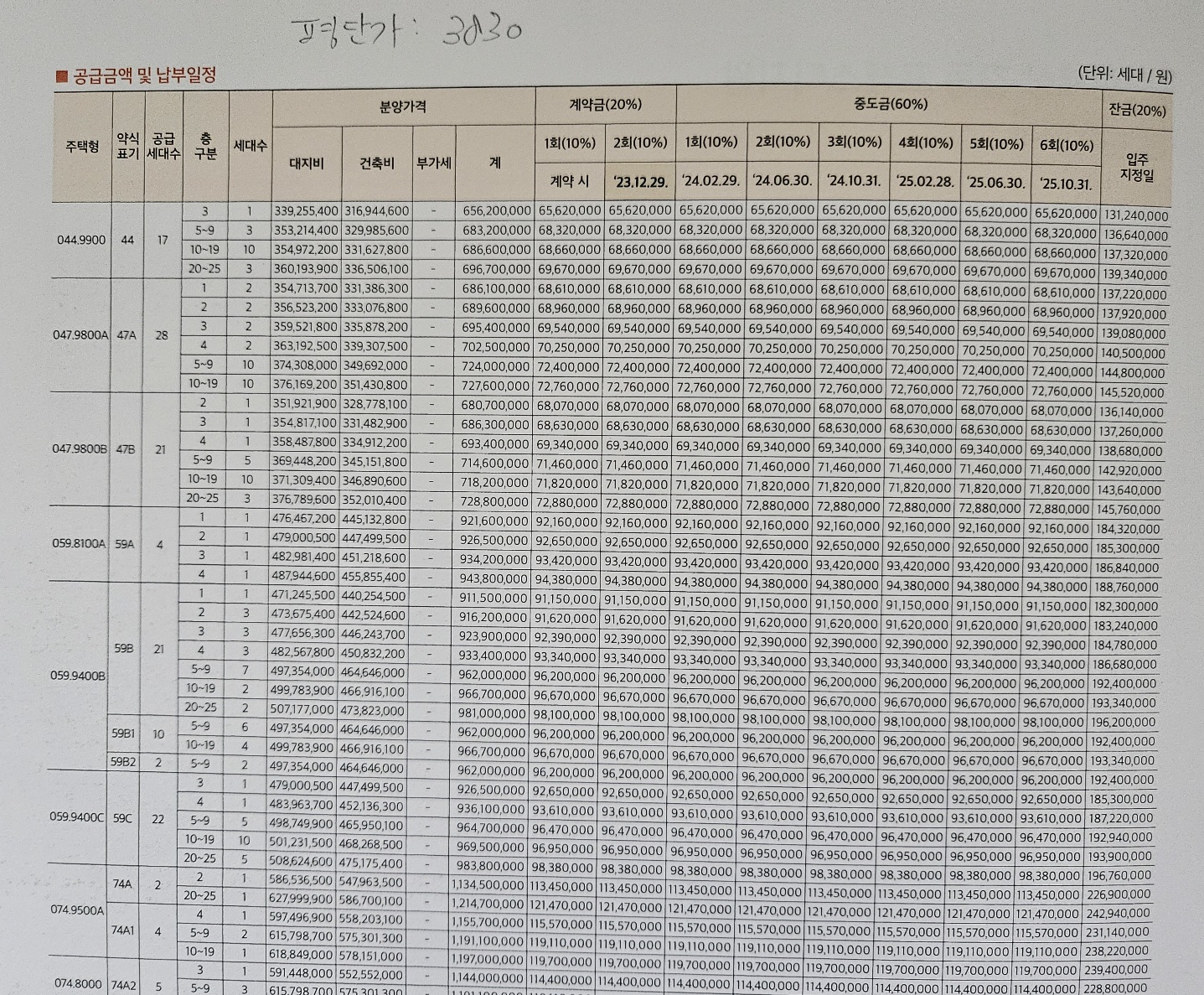평단가는 3830원이라고 보시면 되며, 타입별 분양가를 확인하실 수 있습니다.