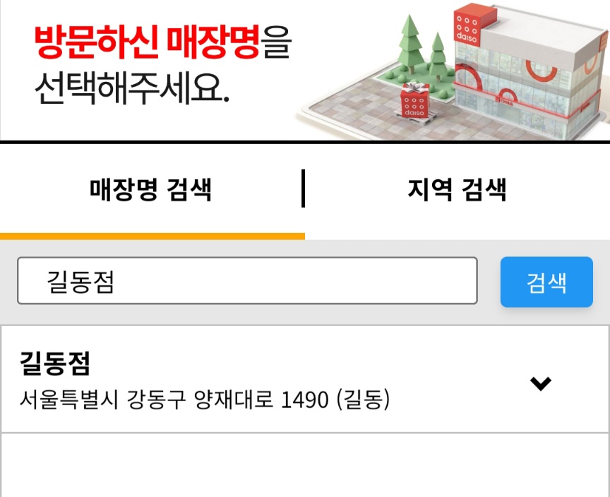 4. 방문하신 매장명 검색창에 매장명 작성하여 선택하기.