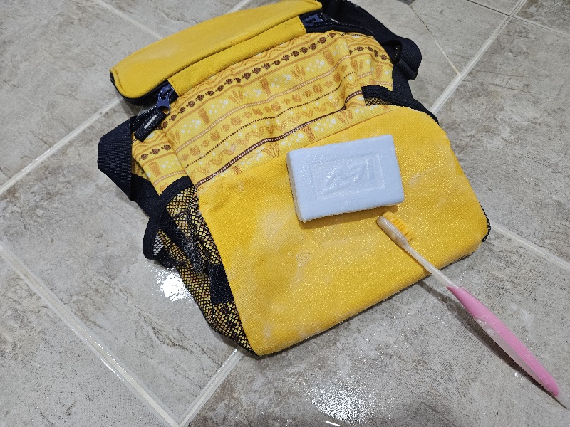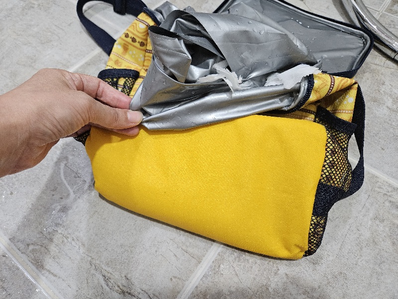 깨끗하게 찌든 때가 지워진 보냉백을 보니 기분이 좋았는데 이런 제가 따뜻한 물에 오래 담갔나 봅니다. 생각해 보니 보냉백은 시원한 온도를 유지시켜 주기 위해 일반 가방과 다르게 방수재질의 원단과 안에 충전재 같은 것이 있다는 것을 생각하지 못했네요.