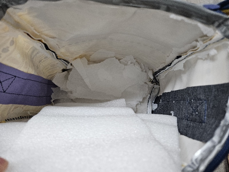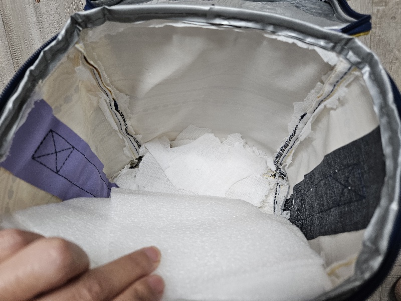 방수원단은 찢어지고 안을 들여다보니 충전재가 다 망가져 버렸답니다. 보냉백은 깨끗해졌지만 보냉 기능을 사용하지 못하게 되어 버리게 되었네요. 제가 왜 아무 생각 없이 빨았는지 후회가 되네요. 저만 이런 경험을 했을까요?