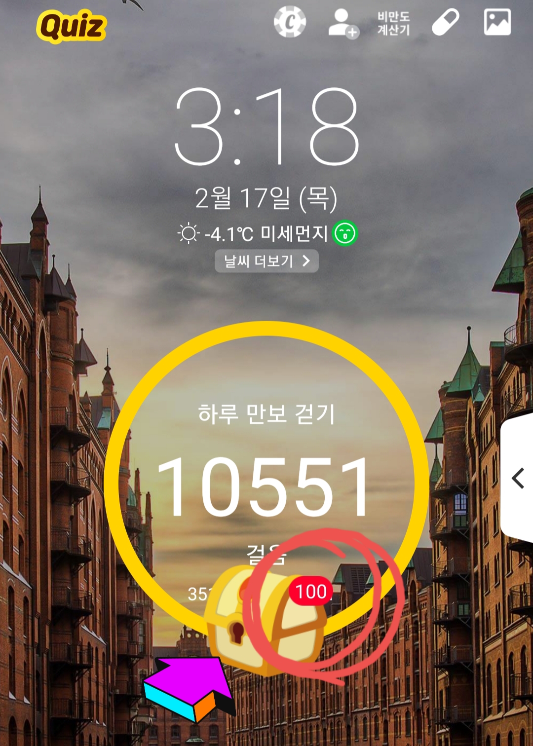 걸으면 포인트가 적립. 하루에 10,000보까지만 적립되며, 만보를 걸으면 100 캐시(100원)를 적립할 수 있어요. 만보 이상을 걷는다 해도 그 이상은 적립이 안된다고 합니다. 보물상자를 터치하면 적립이 되는데 이 보물상자는 밤 12시 이전에 꼭 터치해줘야 해요. 밤 12시 이후에는 다시 초기화가 되기 때문에 자기 전에 꼭 터치하는 거 잊지 마세요. 걷기 만으로만 캐시 적립이 아쉽다면 캐시 워크에 들어가시면 돈 버는 퀴즈라는 곳이 있는데 하루마다 퀴즈를 풀고 캐시 적립도 할 수 있으니 참고하세요.