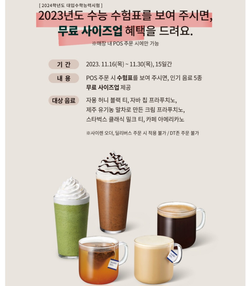 15일간 이루어지는 이벤트로 매장 내 POS 주문 시에만 혜택을 받을 수 있으며 수험표를 보여 주시면 인기 음료 5종을 무료 사이즈업 하실 수 있습니다.
