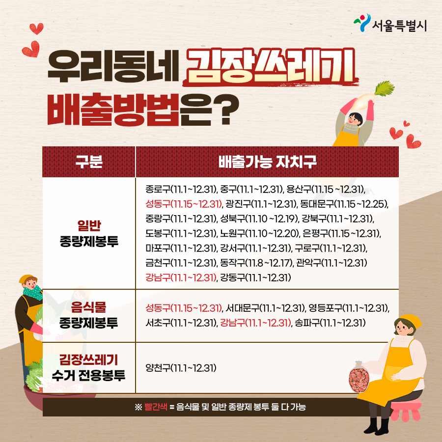 이때 자치구별로 김장철 김장 쓰레기 종량제 봉투 사용하는 방법이 다를 수도 있는데요. 보통은 일반 쓰레기봉투에 김장쓰레기를 버려야 하지만 아래의 자치구는 확인하여 버리셔야 합니다.