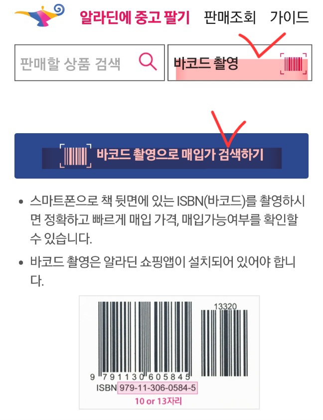 무조건 안 읽는 책이라고 중고서점에 들고 가시면 헛걸음을 하실 수 있습니다. 다 받지는 않거든요. 우선 알라딘 앱을 핸드폰에 설치해 주고 팔고 싶은 책이 알라딘 중고서점에서 매입이 가능한 책인지 확인 후 선별해야 합니다. 그럼 다음과 같은 방법으로 확인하시면 됩니다.