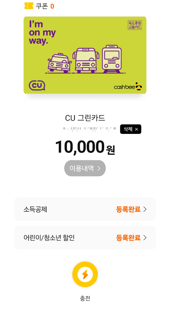 - 편의점에서 교통카드 구입비는 카드 결제가 가능한데 교통카드 충전은 현금만 된다고 하네요. 현금이 없다면 카드 뒷면에 등록 앱을 설치하여 교통카드 등록 후 충전하시면 됩니다. (앱에서는 카드, 계좌이체, 휴대폰 소액결제가 가능)