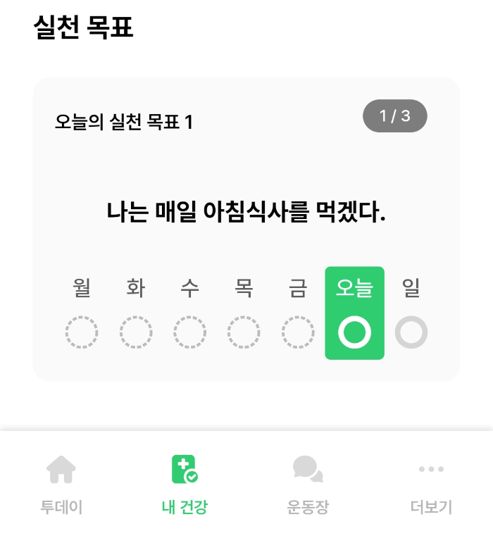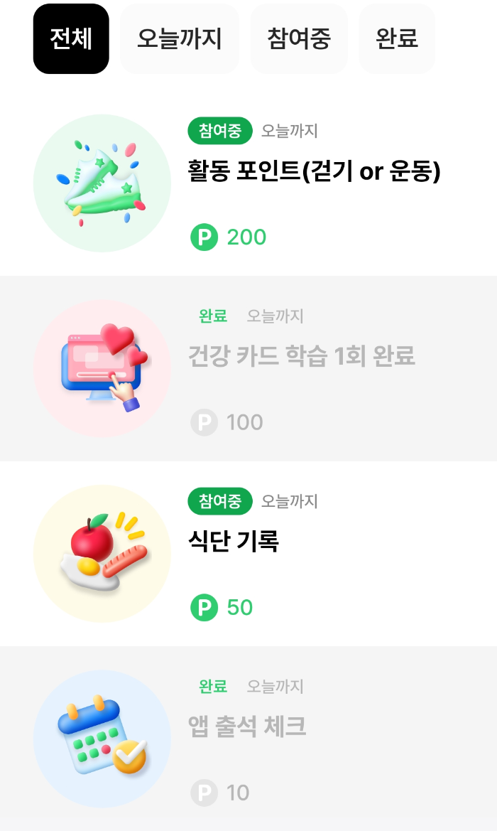 - 승인 후 로그인하면 가입 포인트를 받아서 5~6000원 포인트는 금방 모을 수 있습니다. 첫 화면에서 위로 올리면 하단에 오늘의 실천 목표와 미션 수행하면 포인트를 받을 수 있습니다. 본인의 건강 실천 목표를 설정하고 하루마다 식단 기록, 출석 등을 체크하거나 학습보기 및 건강관리 등록을 하면 추가 포인트를 지급받을 수 있어요.