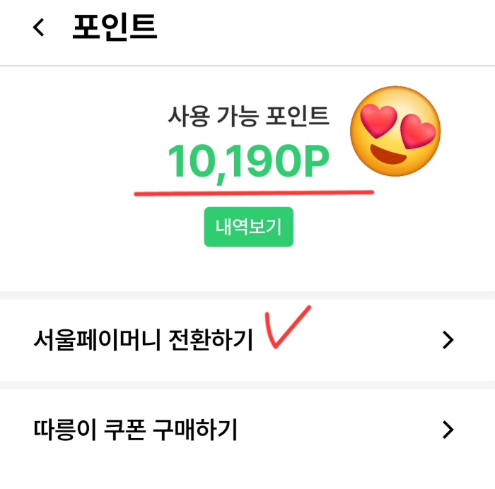 2) 서울페이 전환하기 선택.( 5,000 포인트 이상일 때 전환 가능.)