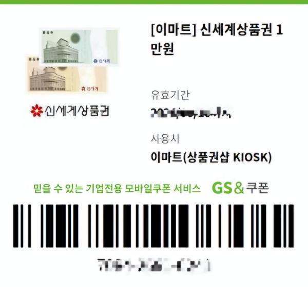 이마트/ 신세계 상품권 모바일 쿠폰을 받으시면 우선 유효기간을 확인합니다. 유효기간이 길면 본인이 일이 있을 때 맞춰서 이마트나 트레이더스, 신세계 백화점 고객센터에 가시면 되는데 짧으면 깜박해서 못 사용할 경우도 있거든요. 그리고 모바일 쿠폰은 지류 신세계 상품권으로 교환 후 결제할 때 사용할 수 있습니다.