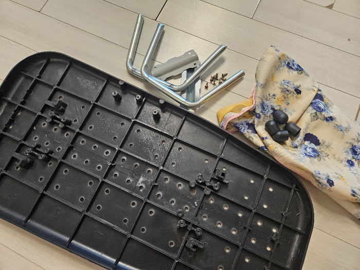 - 작은 +자 드라이버를 사용했더니 조금 힘들었어요. 큰 사이즈 +자 드라이버로 했더니 훨씬 수월하게 나사가 풀리네요. 역시 도구를 잘 써야 해요. 나사를 다 뺐다면 다리 끝 검정 고무를 손으로 살짝 돌리면서 잡아당겨 분리해 주세요.