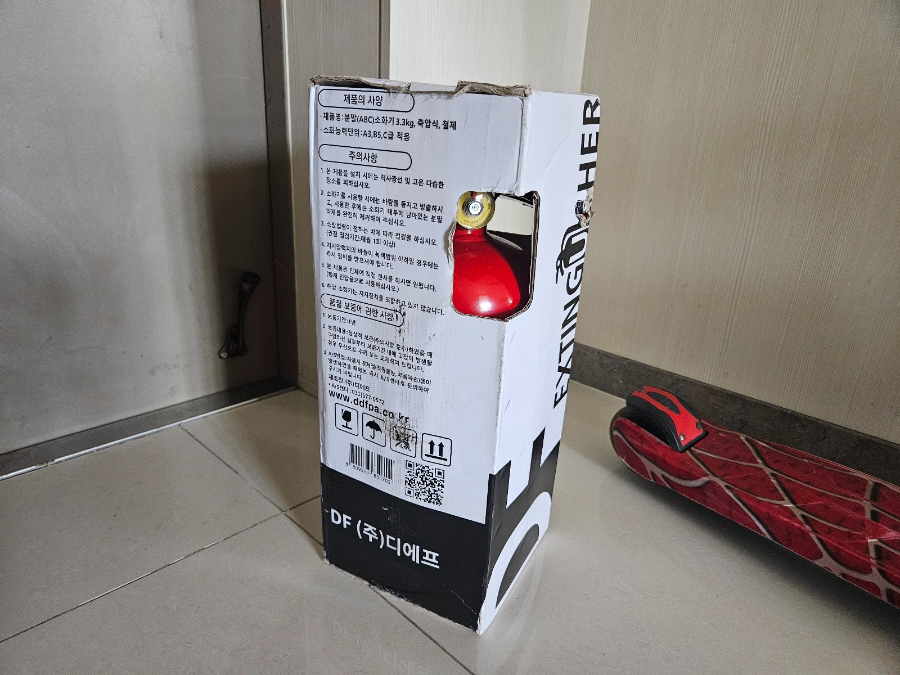 소화기가 택배로 잘 도착한 후 제조년일, 내용 연한, 게이지 표시, 안전핀 확인 후 기존에 있던 소화기 옆에 비치해 놓았습니다. 소화기 하나로 화재 안전에 대비한 것 같아 안심이 되네요. 안 생기면 좋은 일이지만 혹시 모를 화재 대비를 위해 10년이 지난 소화기를 비치하셨다면 점검하여 교체하는 게 좋을 듯합니다.