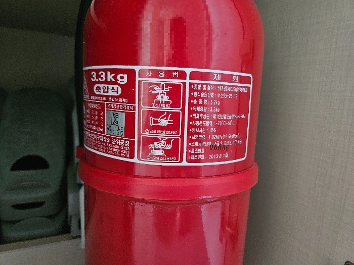 화재에 가장 중요한 소화기는 우선 항목인데 소화기를 찾아보니 현관쪽 신발장 안에 비치되어 있었습니다. 이사 온 아파트가 지은 지 10년이 넘어간다고 했는데 소화기도 10년이 넘었네요. 올해 교체 연도라서 아파트에서 교체해 줄 수도 있다는 동생에 말에 시설팀에 문의했습니다.