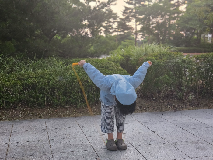 처음 줄넘기 학원을 다녔을 때는 줄넘기만 하고 오니 힘들다며 예전 줄넘기 학원이 그립다고 했는데요. 지금은 여러 기술을 배우고 그 기술을 터득하는 재미에 푹 빠졌어요. 최근에는 2단 뛰기도 20개를 했다고 하네요. 처음에는 수영이 좋다고 하더니 요즘에는 줄넘기가 더 재미있다고 합니다.