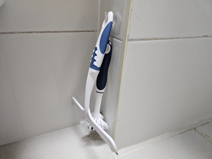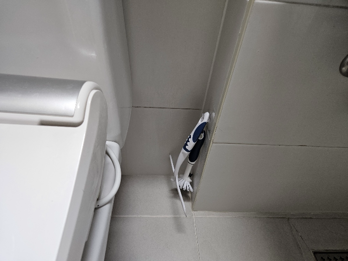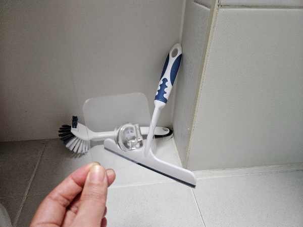 변기 솔과 물기제거기는 화장실 청소의 필수템이라서 화장실마다 비치되어 있는데요. 바닥면에 방치되어 있었던 청소도구를 재점착식 후크사용해서 정리하니 깔끔하네요. 후크가 'ㄴ' 모양이고 폭이 있어서 청소도구 걸 때 넉넉해요. 컬러가 투명이라서 더 깔끔하게 보인답니다.