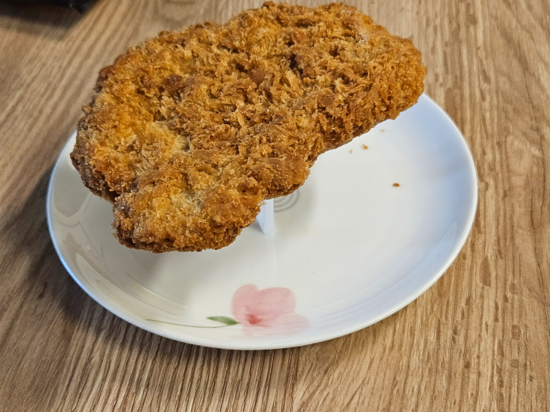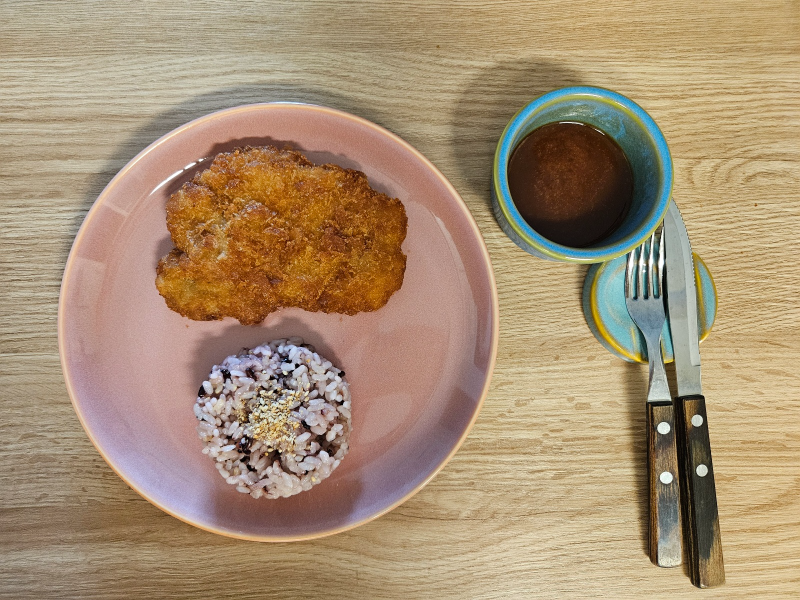 돈까스 식감은 전자레인지에 조리한 것이라서 바삭함보다는 약간 눅눅해요. 전자레인지에서 꺼낸 후 1분 정도 수분을 증발시킨 후 먹으면 조금 눅눅함은 사라질 수는 있어요. 소스는 돈까스에 뿌려먹어도 되지만 소스를 먹어보니 약간 부족해요. 그래서 찍먹으로 먹는 게 더 좋아요.