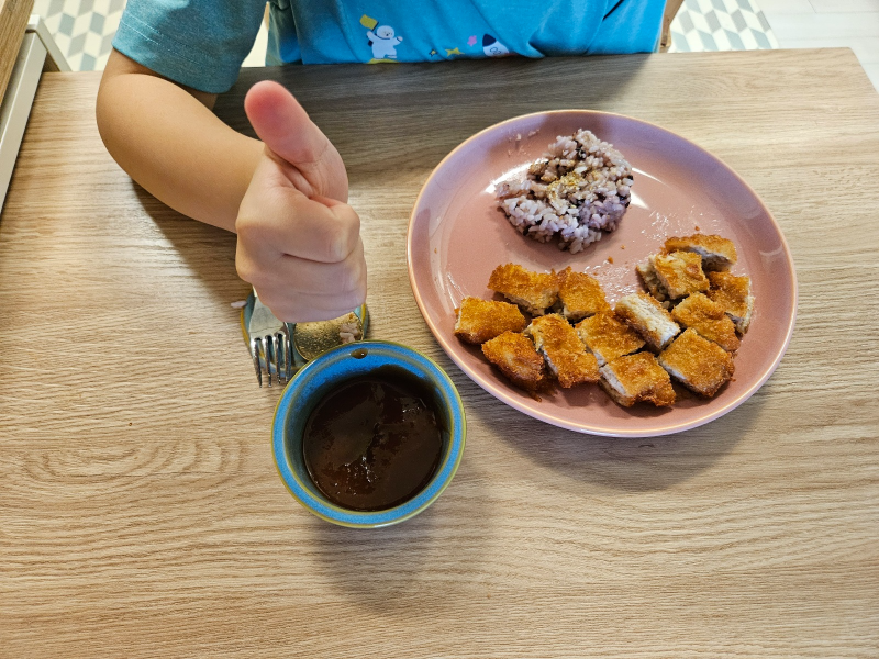 돈까스는 얇은 돈까스를 먹는 느낌이고 잡내는 없어요. 일반 돈까스 맛이에요. 얇아서 그런지 아들은 먹기 편해서 더 좋아해요. 소스는 과일이 들어가서 그런지 달콤한데 아들 입맛에는 잘 맞나 봐요. 소스가 맛있다고 더 없냐고 항상 물어보네요. 소스양이 조금 더 많았으면 좋겠다는 아쉬움이 있어요.