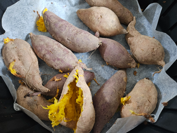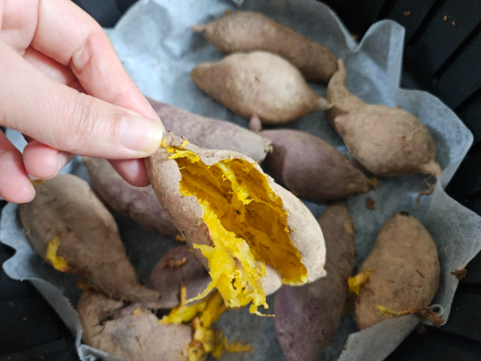 호박 고구마는 수분과 당도가 많은데 그래서 에어프라이로 굽다 보면 익히는 온도와 시간에 따라서 '펑' 하고 터질 때가 있습니다. 이때 펑하고 터진다는 것은 기계 문제가 아니라 호박 고구마가 위 사진처럼 터진다는 것을 말합니다. 호박 고구마가 터지만 사방에 다 묻게 되어 지저분해집니다. 에어프라이어도 굳은 고구마를 청소해야 하는 번거로움도 생기고요.