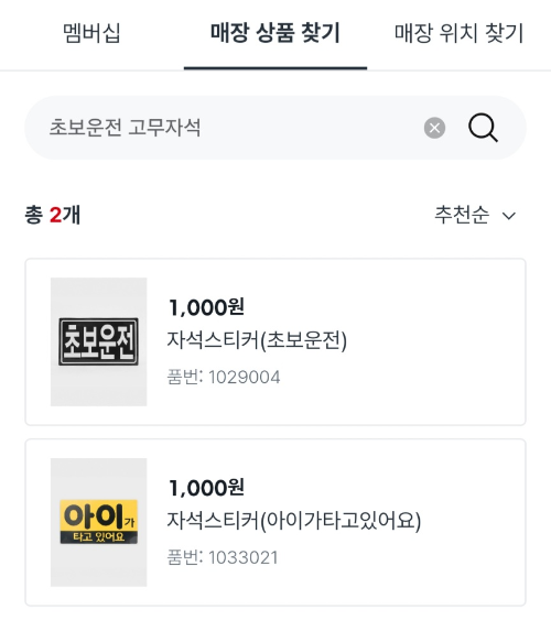 3. 검색창에 원하는 제품명을 입력하기. 예) 초보운전 고무자석