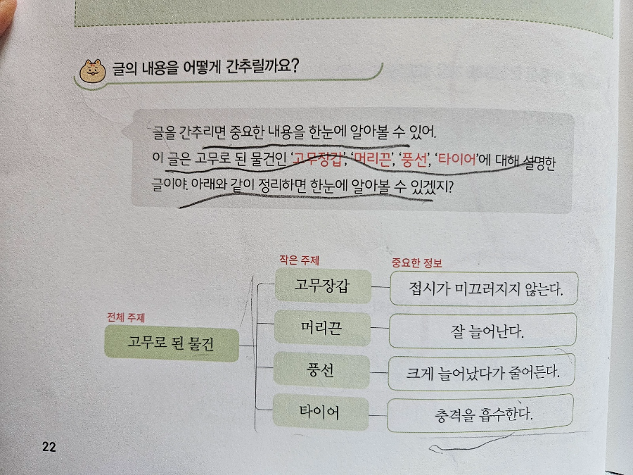 기초가 끝나면 연습을 하게 됩니다. 기초 편에서 문제가 1~2개 정도라면 연습에서는 4개로 늘어나는데요. 기초에서 여러 번 했던 중심 낱말, 중심 문장, 간추리기 등을 설명문 읽고 이해하며 풀 수 있도록 되어있습니다. 설명문을 잘 이해한다면 풀 수 있지만 집중하지 않고 대충 읽으면 틀립니다. 글에 답이 있다고 알려주지만 잘 이해 못 할 때도 있어요.