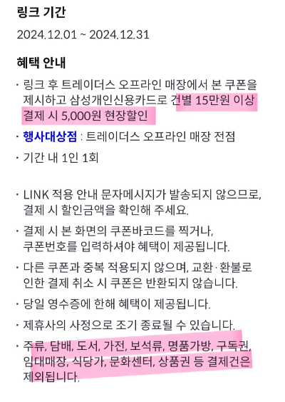 가장 자주 이용하는 삼성카드 월 혜택은 트레이더스 오프라인 매장 5,000원 할인쿠폰인데요. 링크 혜택에 트레이더스 오프라인 매장 링크가 있는데 선택하면 바코드 쿠폰이 나오며 혜택 안내를 확인할 수 있습니다. 조건에 맞는 결제 금액이라며 매장에서 쿠폰이 있다고 말하고 할인 바코드 제시하면 5,000원 현장할인을 받을 수 있어요.