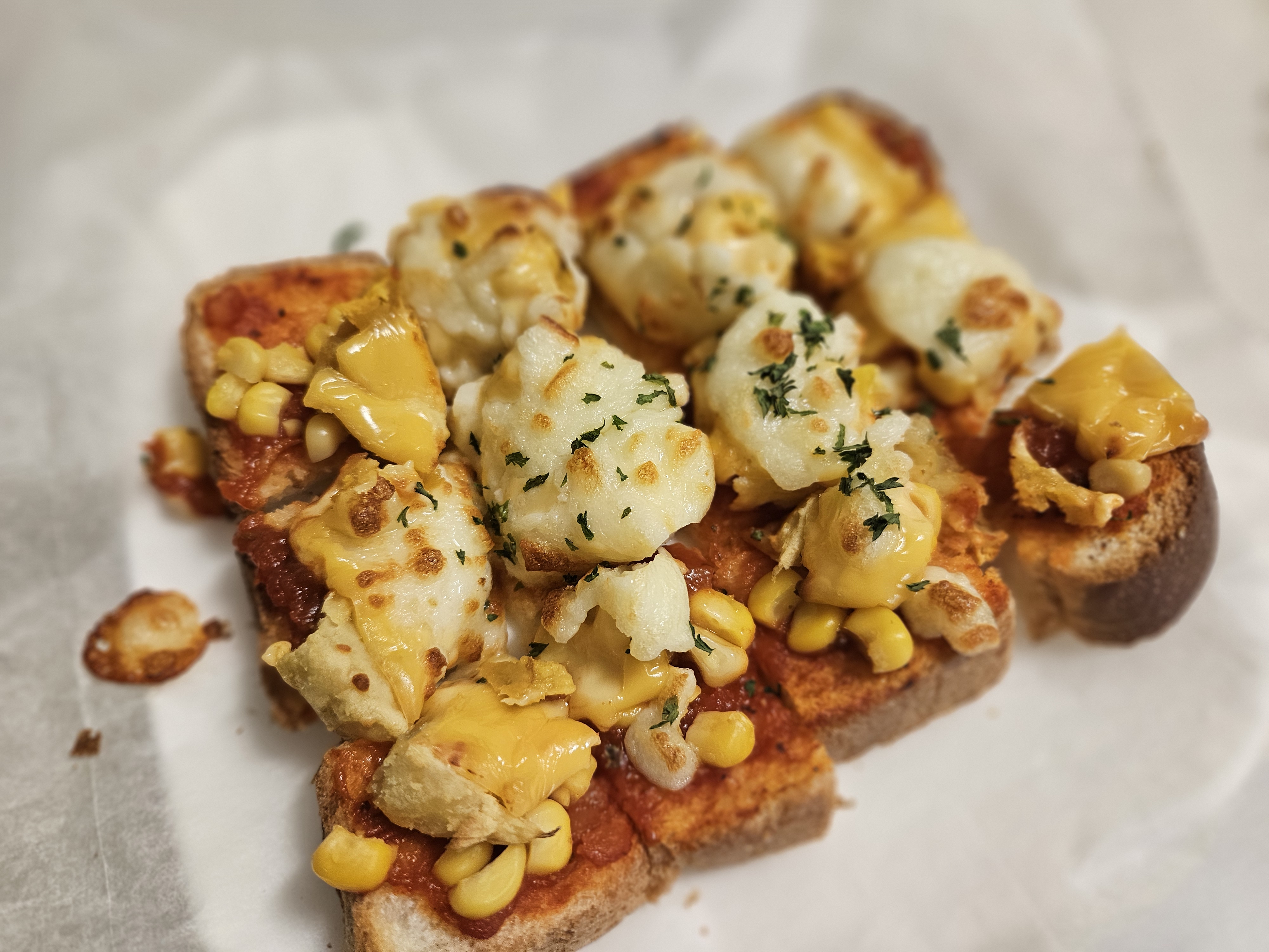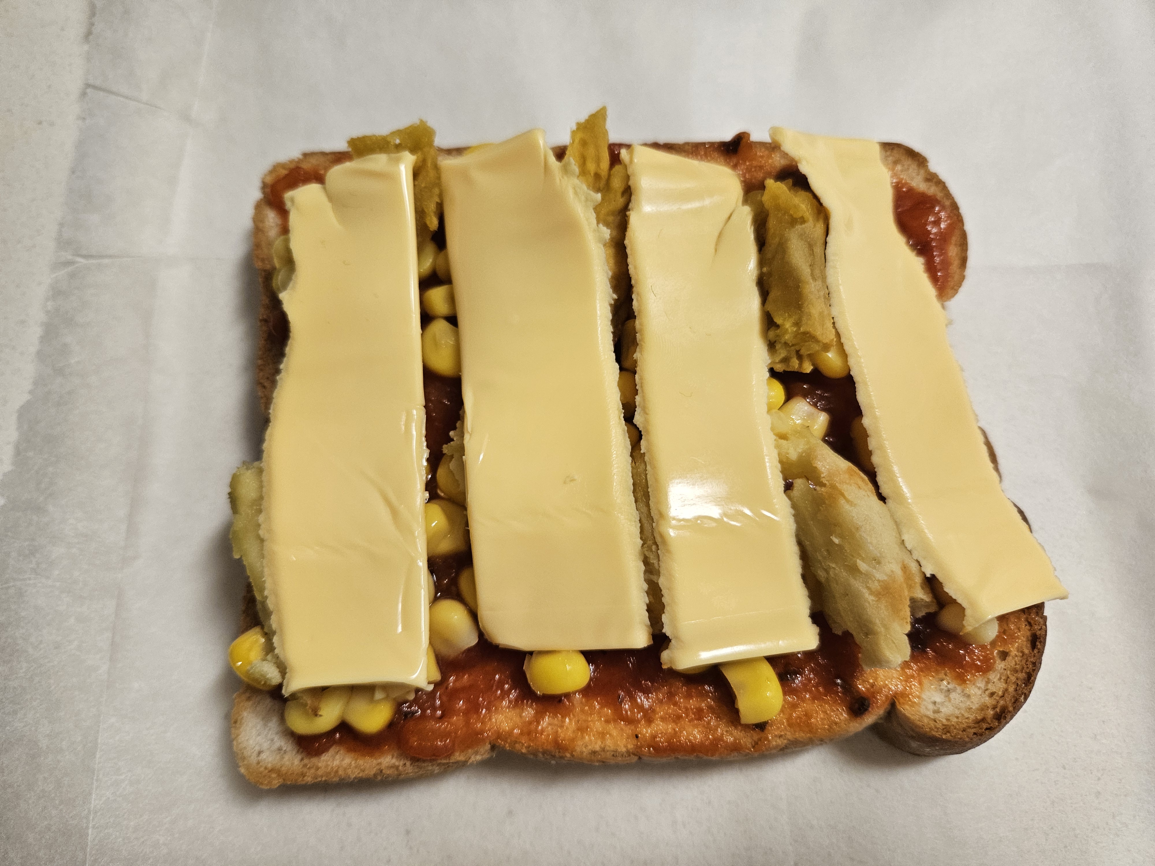 재료 : 식빵 1개, 토마토 스파게티 소스 2스푼, 콘옥수수 통조림 1 스푼, 찐 고구마 또는 군고구마 1~2개, 체다치즈 1, 모차렐라치즈 2 스푼, 파슬리 조금