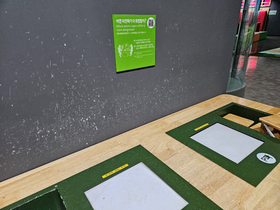 어떤 지진파가 더 위험할까에 대해 직접 건물 모형을 올려서 체험해 봤는데 신기해하며 한참 지켜봤어요. 해파 만들기가 긴 유리관에 만들어져 있었는데 해파의 강도를 조절해 보면서 확인하는 것이 흥미로웠어요. 3층에서 천천히 체험 다하고 나서 2층으로 가보았어요.